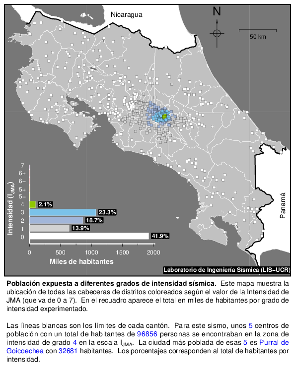 Cada punto sobre el mapa es la cabecera de un distrito. El número de habitantes que hay en cada uno se suma si se encuentra dentro de una misma zona de intensidad sísmica y el total se muestra en el recuadro en manera de porcentajes del total de la población y en miles de habitantes.