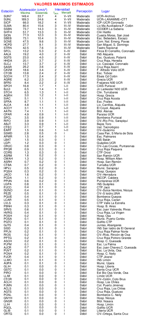 La siguiente tabla muestra los valores de Aceleración Máxima o aceleración pico (PGA por sus siglas en inglés). Este es el valor máximo en cualquiera de las 3 componentes del registro.