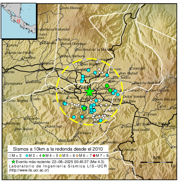 El sismo de mayor magnitud ha sido el del 22-08-2025 a las 00:45:37 con M4.3. Dentro del perímetro viven 743206 personas y el lugar más poblado es San Francisco de Heredia con 49209 habitantes.