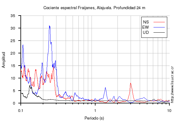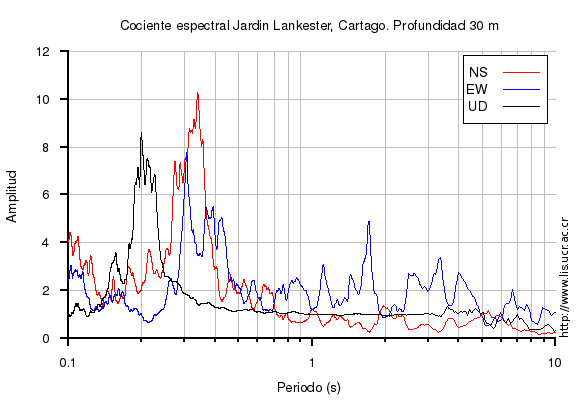 El cociente espectral se obtuvo dividiendo el espectro de amplitud de la componente en superficie con respecto a la componente en profundidad (NS=norte-sur, EW=este-oeste, UD=vertical)