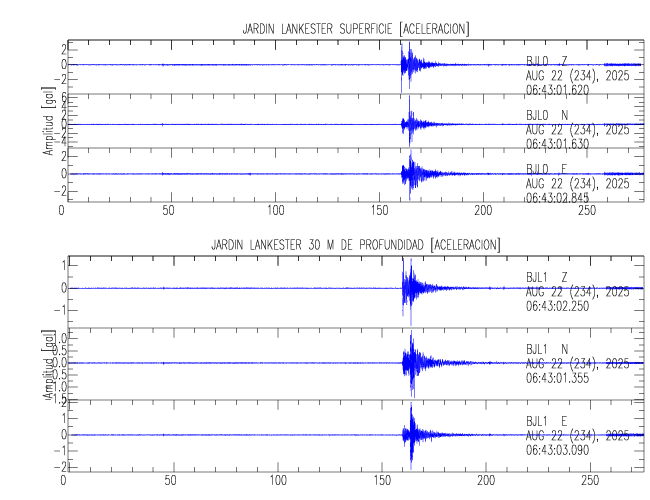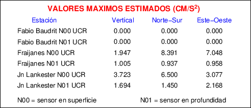 Aquí se muestran las formas de onda y cocientes espectrales de los sensores colocados en pozo . Uno se ubica en el Jardín Lankester en Paraíso de Cartago con 30 m de profundidad y el otro en la Estación Experimental Fabio Baudrit en Alajuela con 40 m de profundidad. La tabla muestra los valores de aceleración máxima (PGA) leídos de las tres componentes en superficie (N00) y en profundidad (N01)