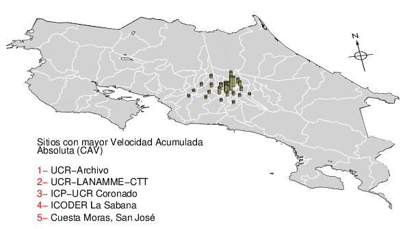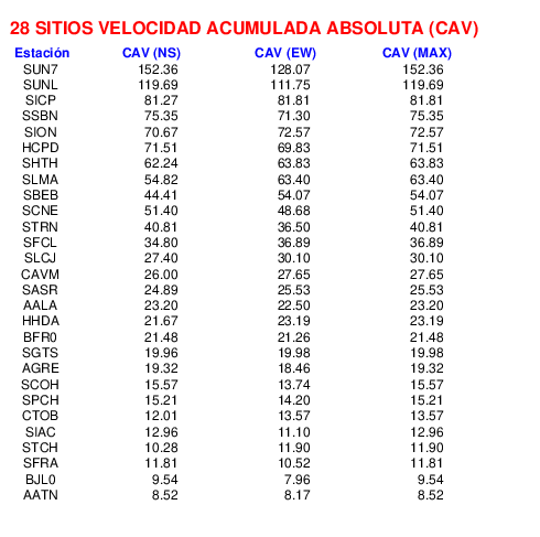 La velocidad acumulada absoluta (CAV por sus siglas en inglés) es otro parámetro que se usa para caracterizar el movimiento fuerte del suelo. Los datos están dados en cm/s para las componentes norte-sur (NS) y este-oeste (EW). El máximo de ambas se da en la tercera columna.