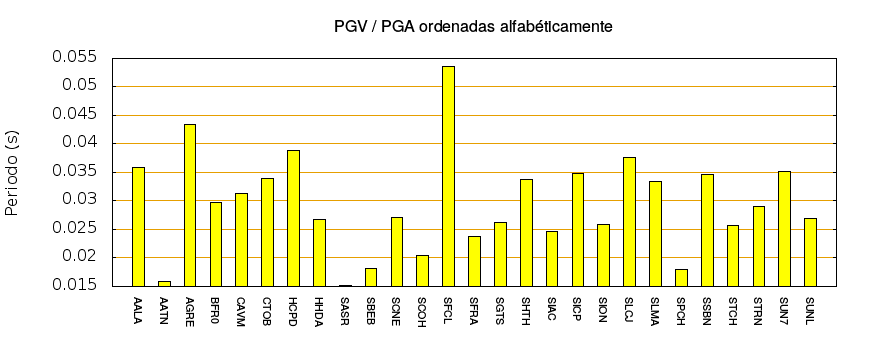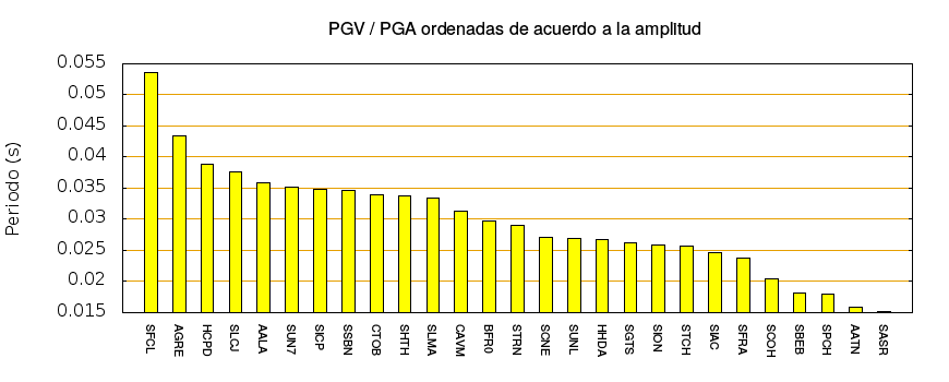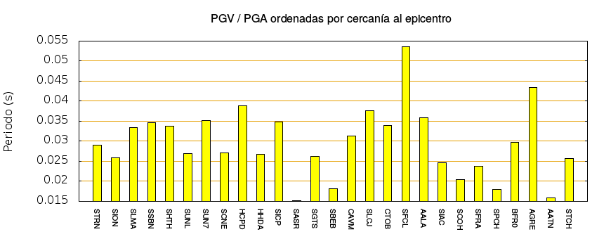 El cociente de la velocidad máxima (PGV) entre la aceleración máxima (PGA) brinda información de los periodos más significativos del movimiento del suelo. En el gráfico siguiente se muestran las estaciones ordenadas por su cercanía al epicentro. La más cercana está a la izquierda y la más lejana a la derecha. También se muestran los mismos datos en orden alfabético y ordenados de mayor a menor amplitud.
