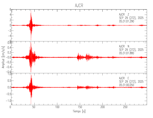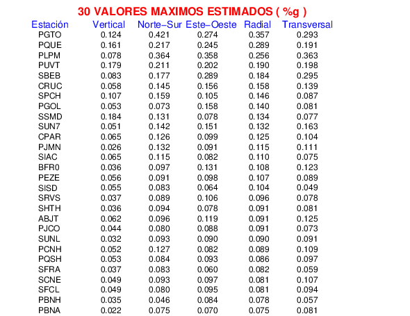 La siguiente tabla muestra los datos de aceleración máxima para cada componente en porcentaje de la aceleración de la gravedad (%g). Estos se obtienen dividiendo el valor del PGA registrado por 980 cm/s2 y multiplicándolo por 100. Los valores de las últimas dos columnas corresponden a la componente radial y transversal. Los datos se listan en orden descendente según el valor de la componente radial.