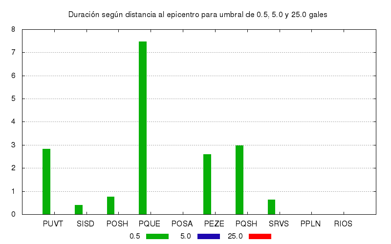 La duración para otros niveles de aceleración también se calculó. Este es el gráfico con los valores de duración para umbrales de 0.5, 5.0 y 25.0 gales. Se muestran los 10 primeros sitios ordenados por su cercanía el epicentro.