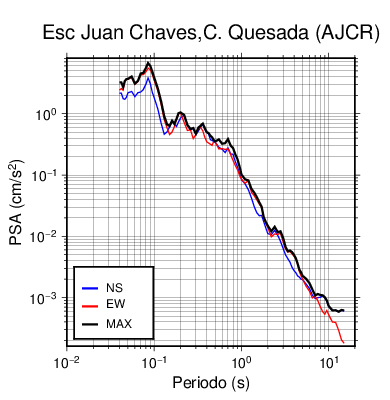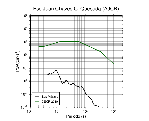 En los siguientes gráficos, la traza verde es el espectro propuesto por el CSCR-2010, la traza negra es el espectro máximo de este sismo. El valor de la amplitud está dado en pseudoaceleración en cm/s2.