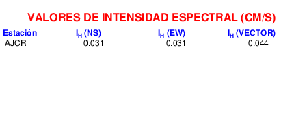 En esta sección se muestra el cáculo de la intensidad de Housner, IH para la componente norte-sur (NS) y este-oeste (EW) y la suma vectorial de los registros de aceleración que tuvieron valores superiores a los 5 cm/s2.