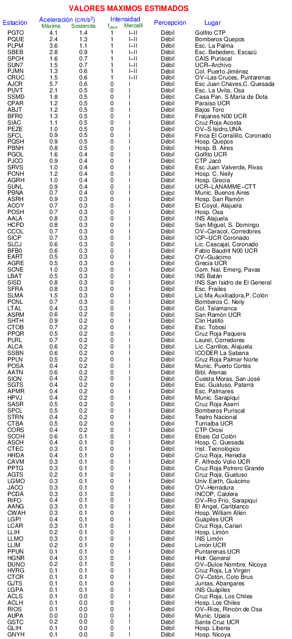 La siguiente tabla muestra los valores de Aceleración Máxima o aceleración pico (PGA por sus siglas en inglés). Este es el valor máximo en cualquiera de las 3 componentes del registro.