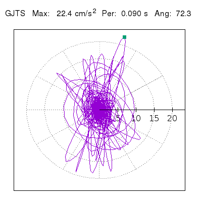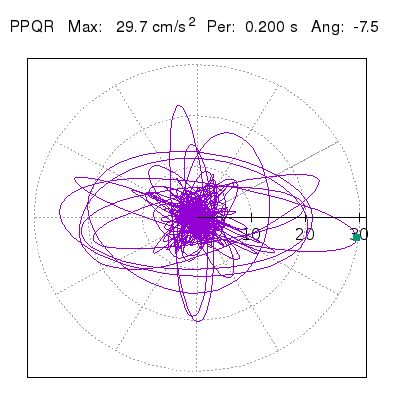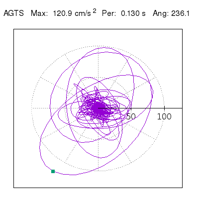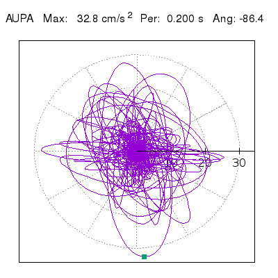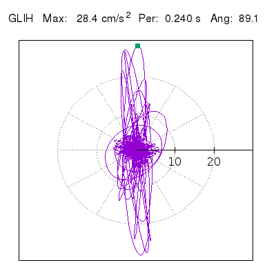 Tomando el periodo en el cual se presenta la amplitud máxima del espectro de respuesta máxima para cada estación, se representa la respuesta bidireccional en función del tiempo sobre el plano horizontal. Se identifica el punto (color verde en cada figura) del cual se desprende la orientación mostrada en el mapa de la sección superior. El valor de la acelereración máxima corresponde al punto del espectro de respuesta para el periodo indicado.