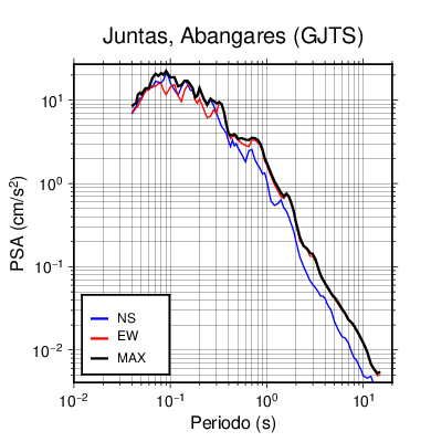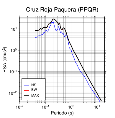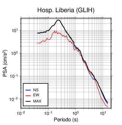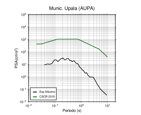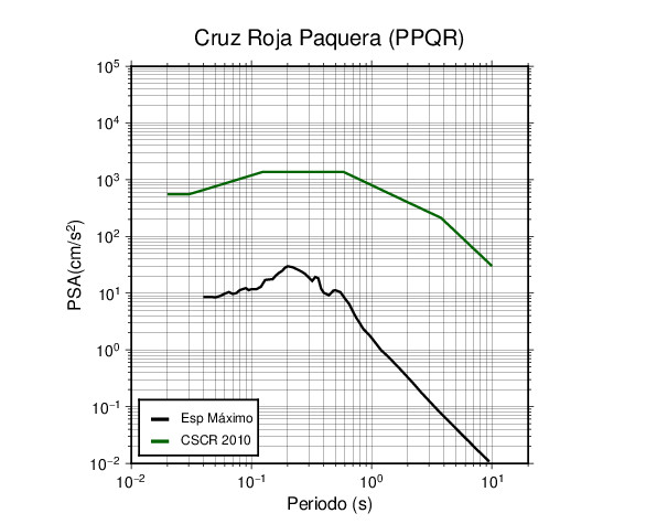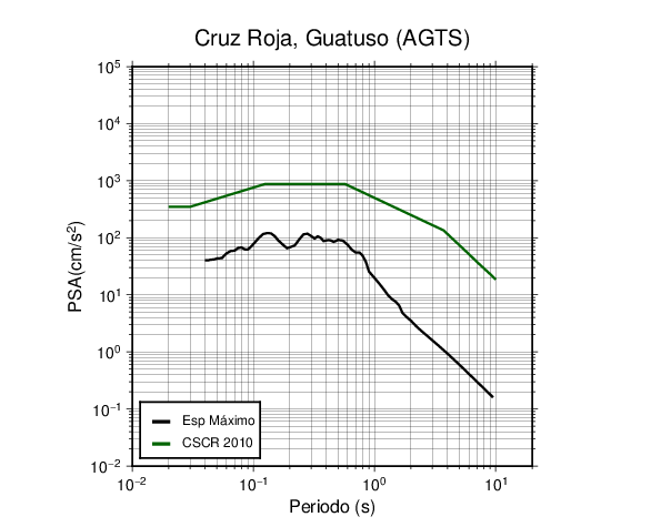 En los siguientes gráficos, la traza verde es el espectro propuesto por el CSCR-2010, la traza negra es el espectro máximo de este sismo. El valor de la amplitud está dado en pseudoaceleración en cm/s2.