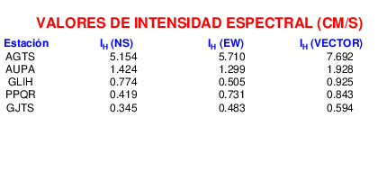 En esta sección se muestra el cáculo de la intensidad de Housner, IH para la componente norte-sur (NS) y este-oeste (EW) y la suma vectorial de los registros de aceleración que tuvieron valores superiores a los 5 cm/s2.