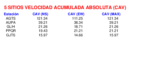 La velocidad acumulada absoluta (CAV por sus siglas en inglés) es otro parámetro que se usa para caracterizar el movimiento fuerte del suelo. Los datos están dados en cm/s para las componentes norte-sur (NS) y este-oeste (EW). El máximo de ambas se da en la tercera columna.