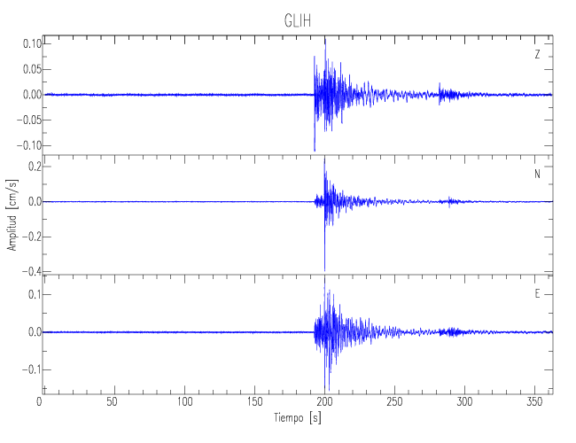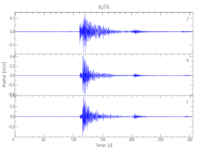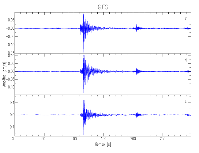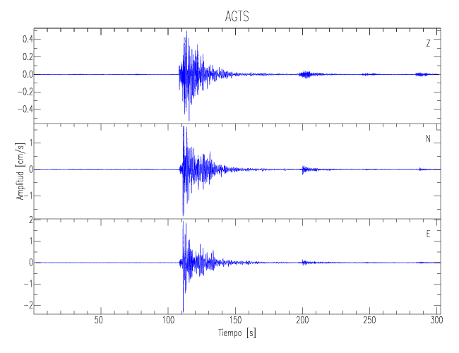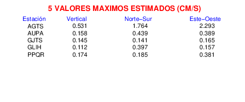 Los registros de velocidad se obtienen de la integración de los datos de aceleración. Esta tabla contiene los valores de velocidad máxima (PGV por sus siglas en inglés) para cada componente en cm/s. Las estaciones se listan en orden alfabético y corresponden a los sitios en que el nivel de aceleración fue superior a los 5 cm/s2.