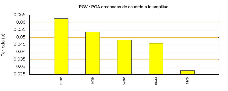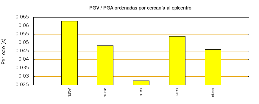 El cociente de la velocidad máxima (PGV) entre la aceleración máxima (PGA) brinda información de los periodos más significativos del movimiento del suelo. En el gráfico siguiente se muestran las estaciones ordenadas por su cercanía al epicentro. La más cercana está a la izquierda y la más lejana a la derecha. También se muestran los mismos datos en orden alfabético y ordenados de mayor a menor amplitud.