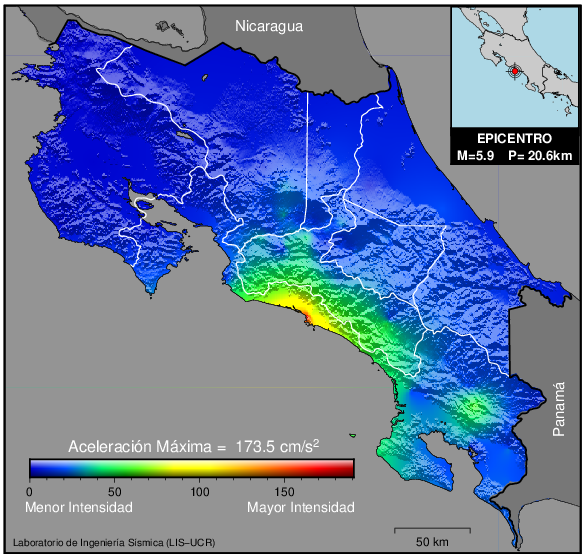 Los datos de aceleración máxima registrada se interpolan para obtener un mapa de isoaceleraciones. En el se puede ver la tendencia general de la amplificación de todo el país a partir del lugar en que el movimiento fue más intenso.