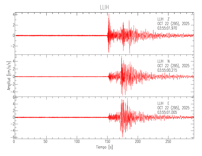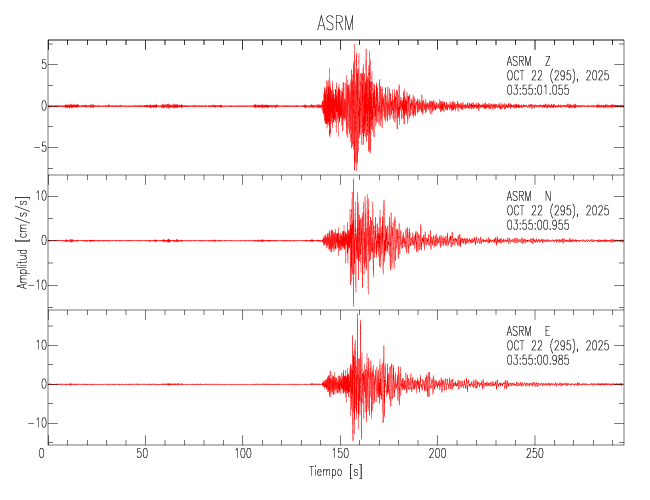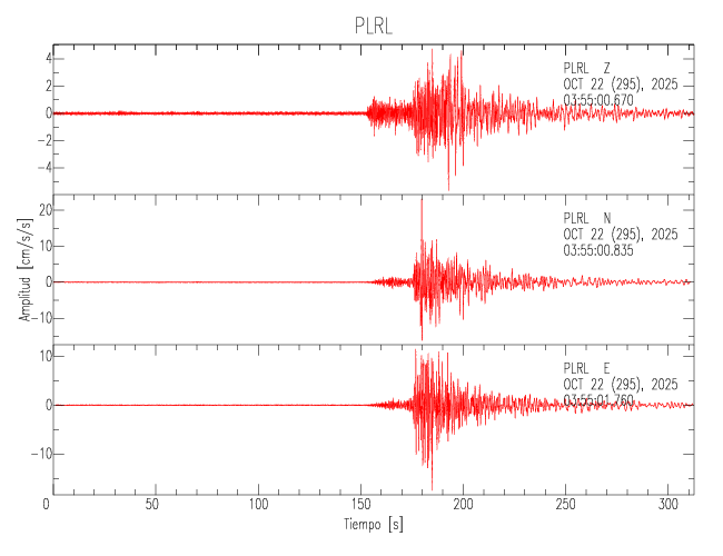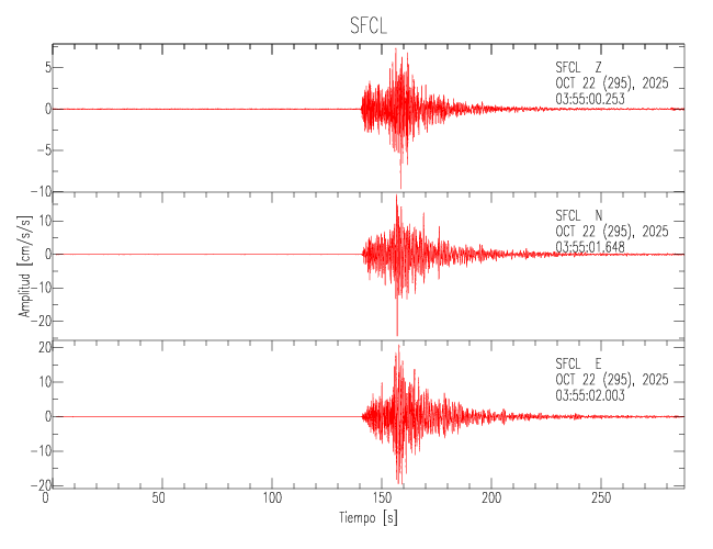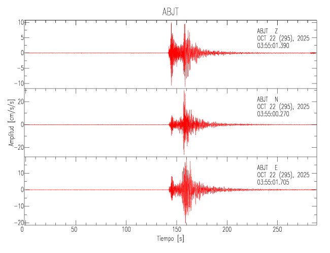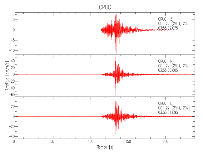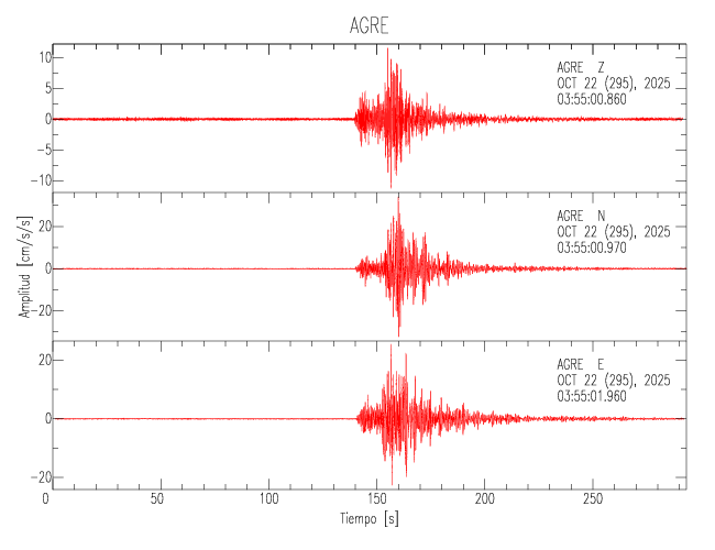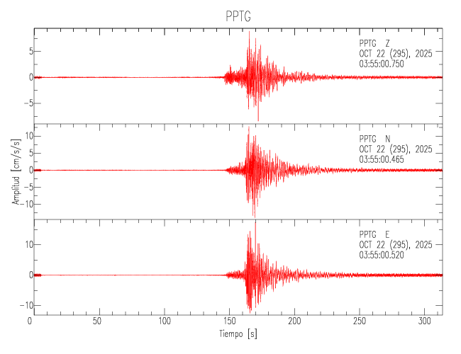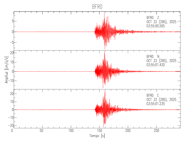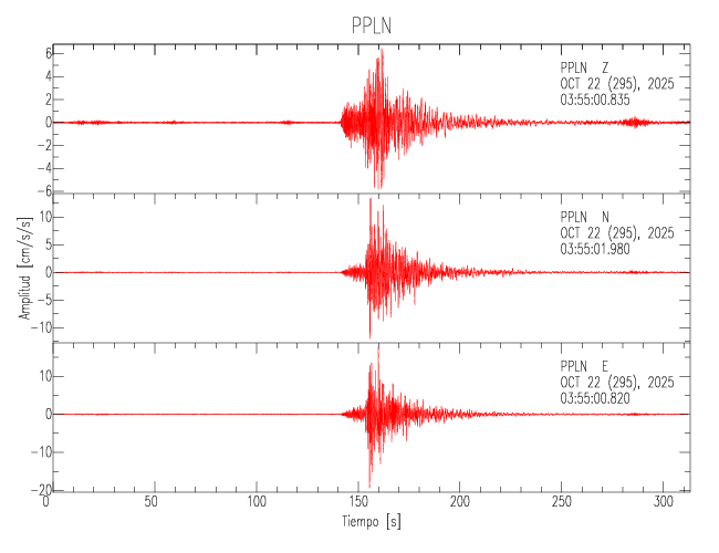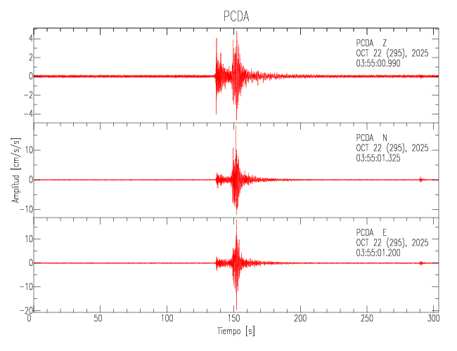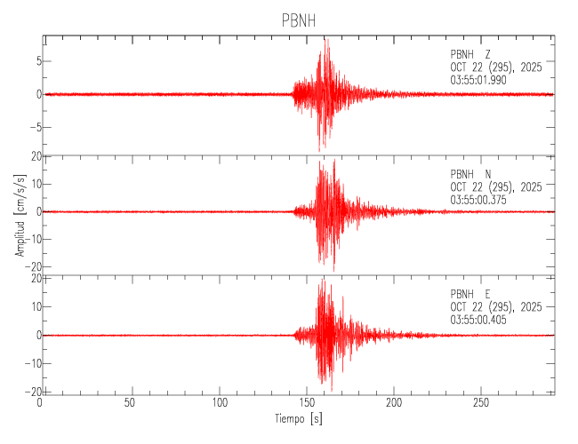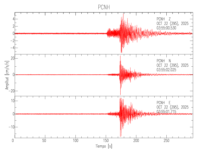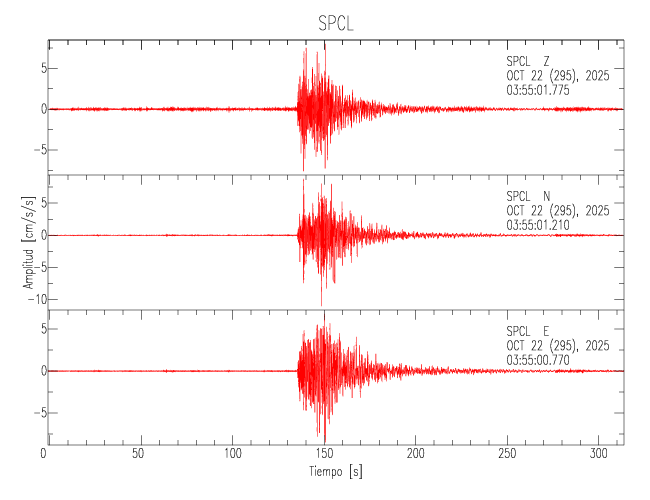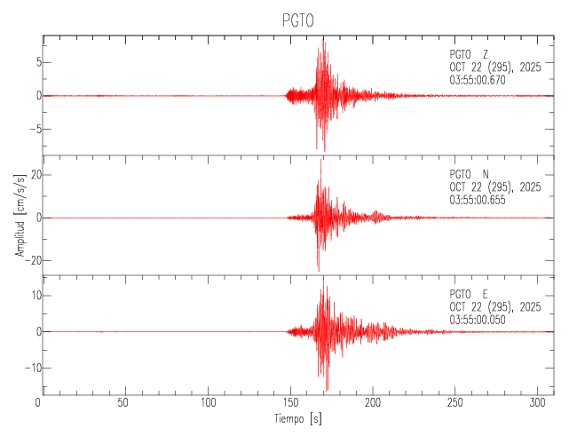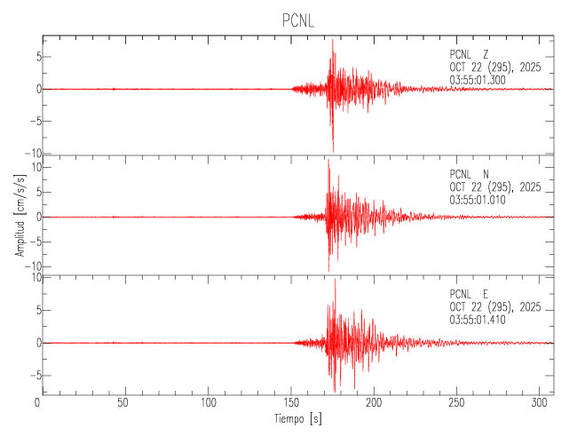 La siguiente tabla muestra los datos de aceleración máxima para cada componente en porcentaje de la aceleración de la gravedad (%g). Estos se obtienen dividiendo el valor del PGA registrado por 980 cm/s2 y multiplicándolo por 100. Los valores de las últimas dos columnas corresponden a la componente radial y transversal. Los datos se listan en orden descendente según el valor de la componente radial.