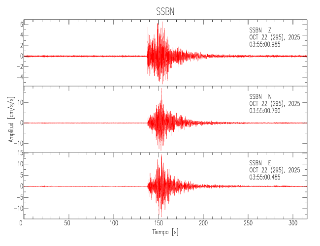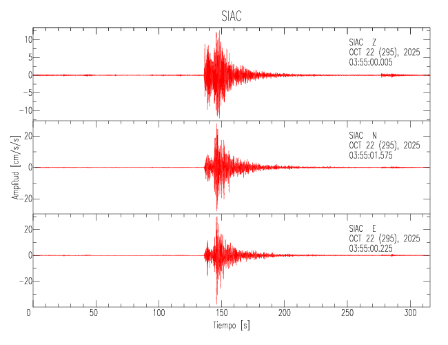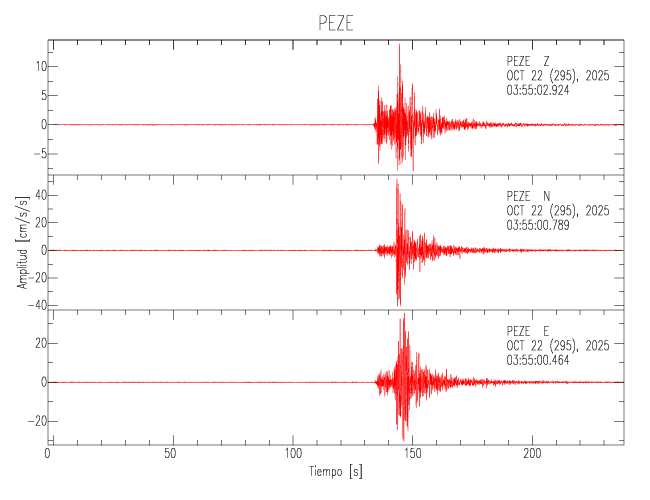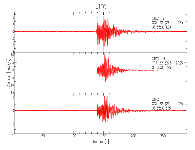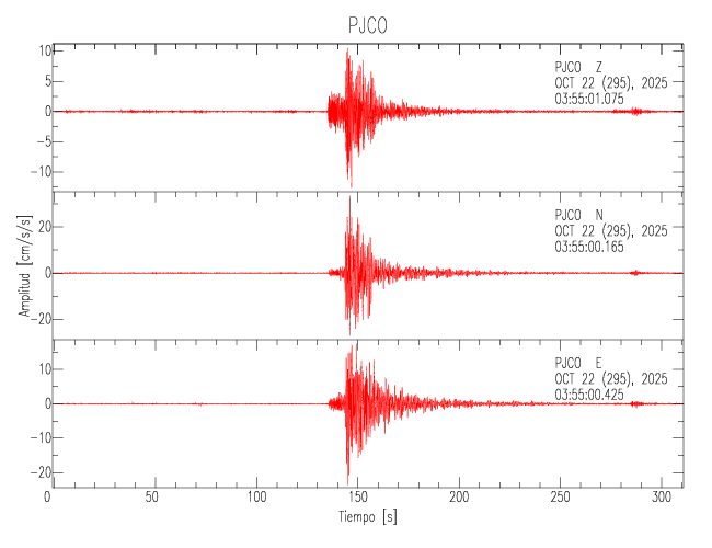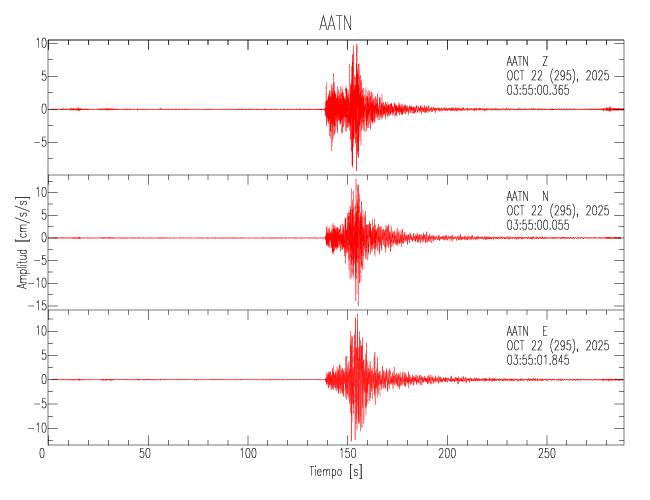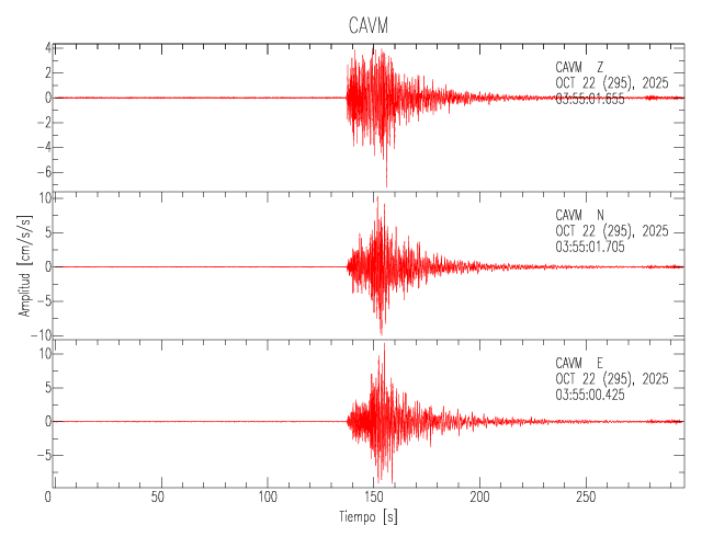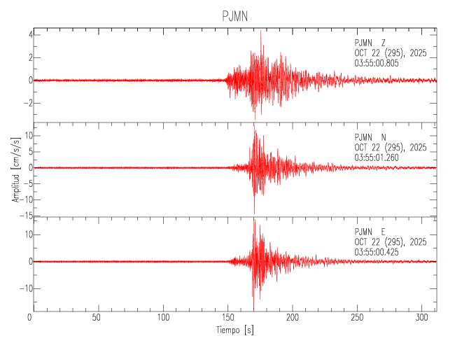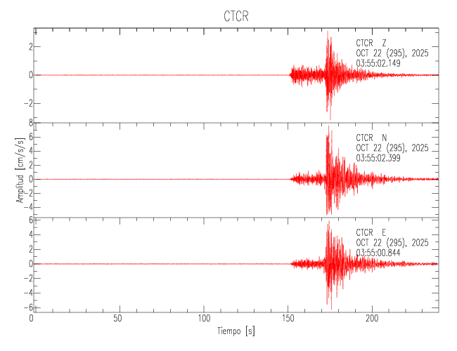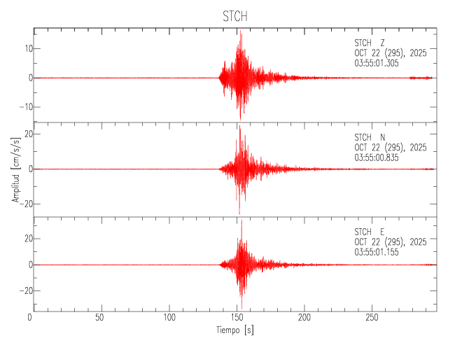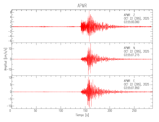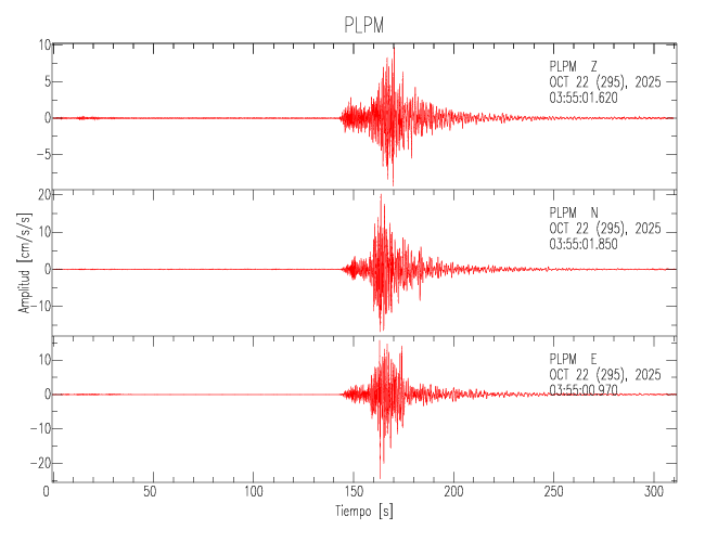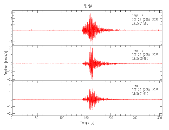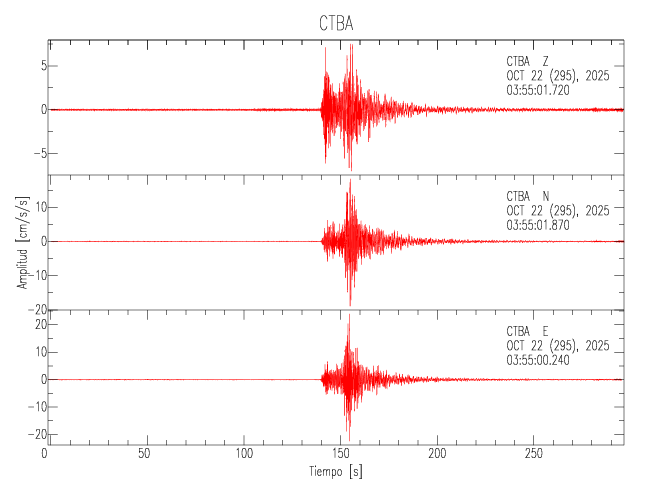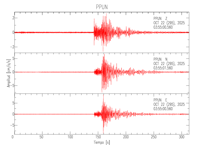 La siguiente tabla muestra los datos de aceleración máxima para cada componente en porcentaje de la aceleración de la gravedad (%g). Estos se obtienen dividiendo el valor del PGA registrado por 980 cm/s2 y multiplicándolo por 100. Los valores de las últimas dos columnas corresponden a la componente radial y transversal. Los datos se listan en orden descendente según el valor de la componente radial.
