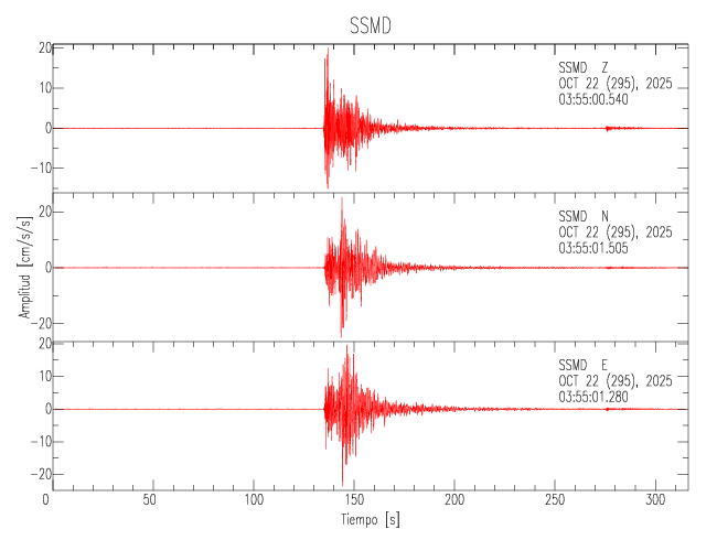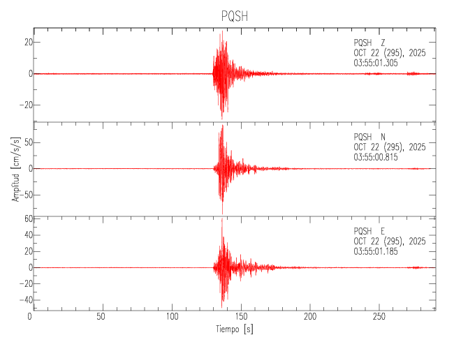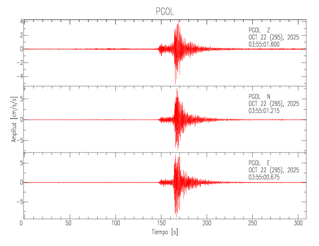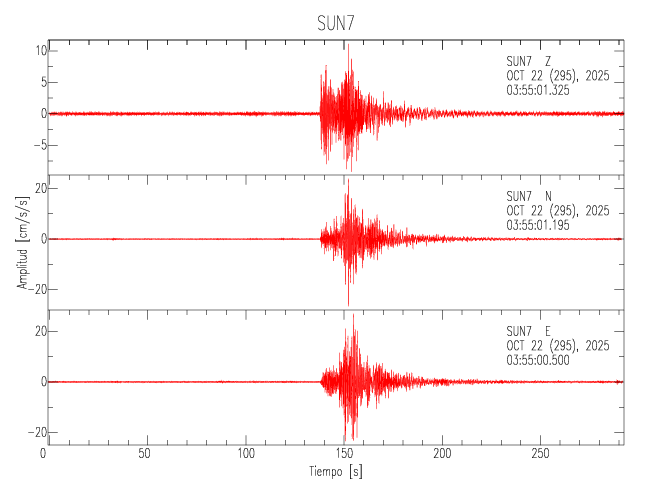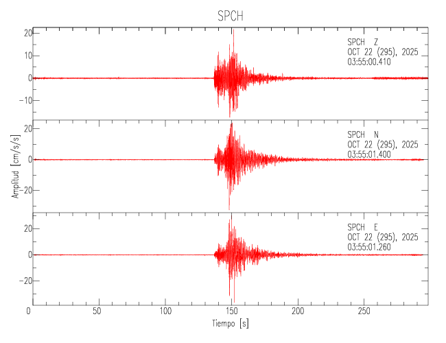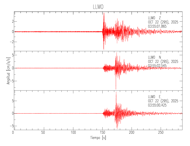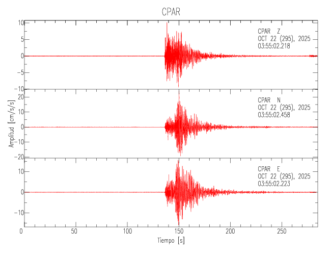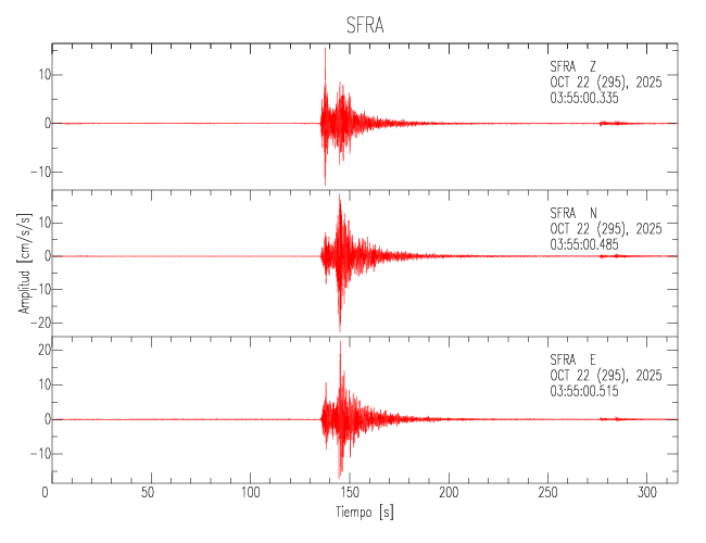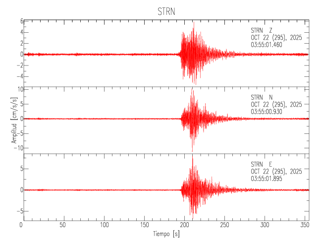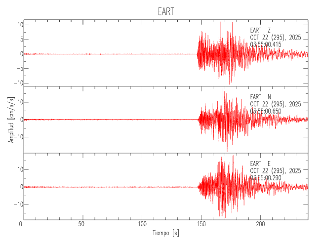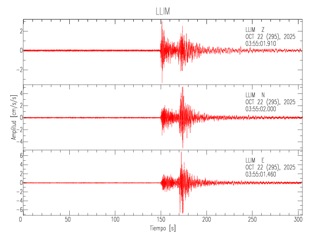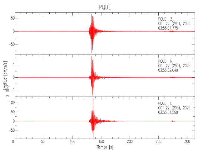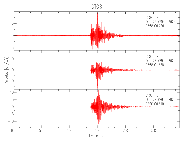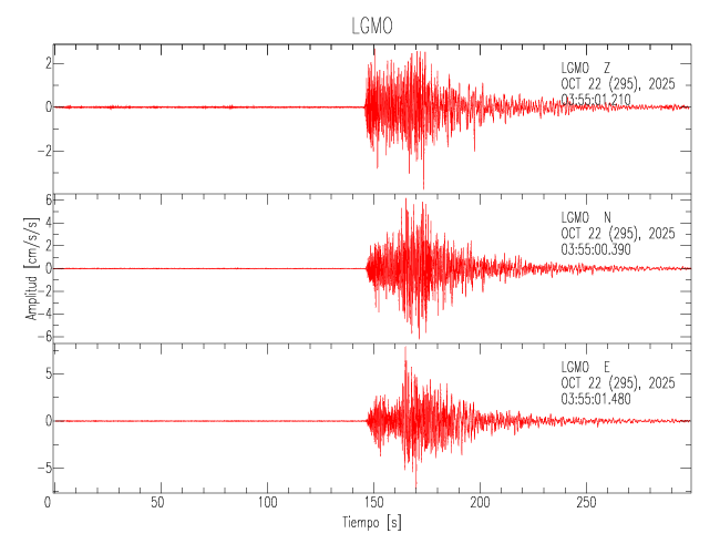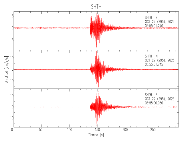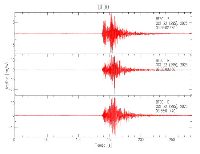 La siguiente tabla muestra los datos de aceleración máxima para cada componente en porcentaje de la aceleración de la gravedad (%g). Estos se obtienen dividiendo el valor del PGA registrado por 980 cm/s2 y multiplicándolo por 100. Los valores de las últimas dos columnas corresponden a la componente radial y transversal. Los datos se listan en orden descendente según el valor de la componente radial.