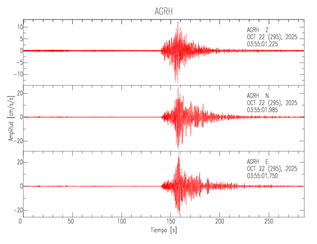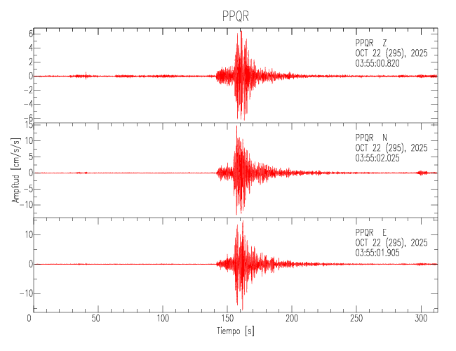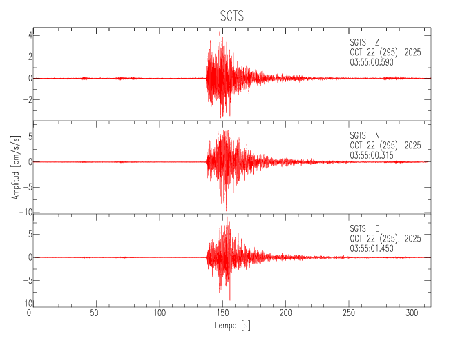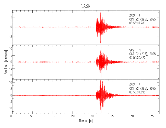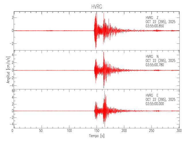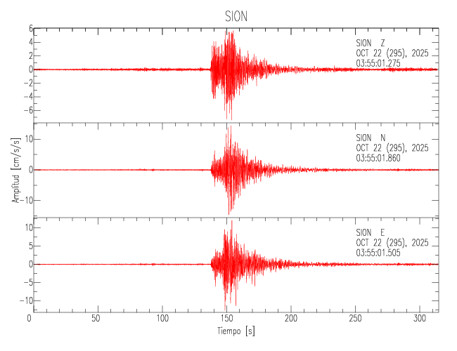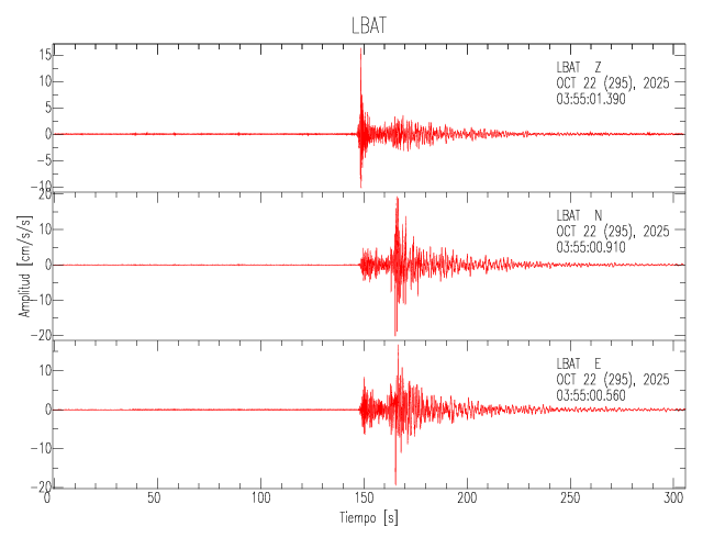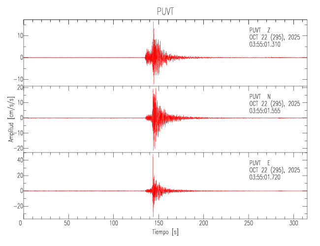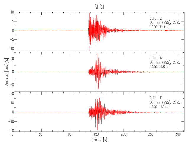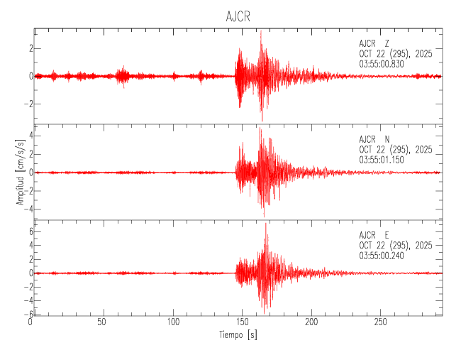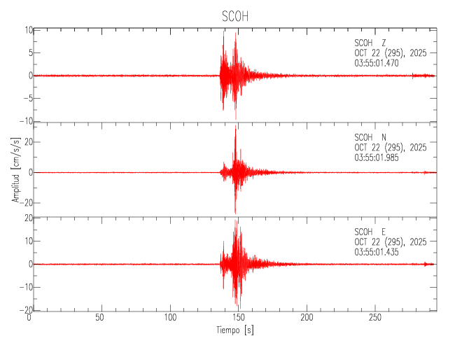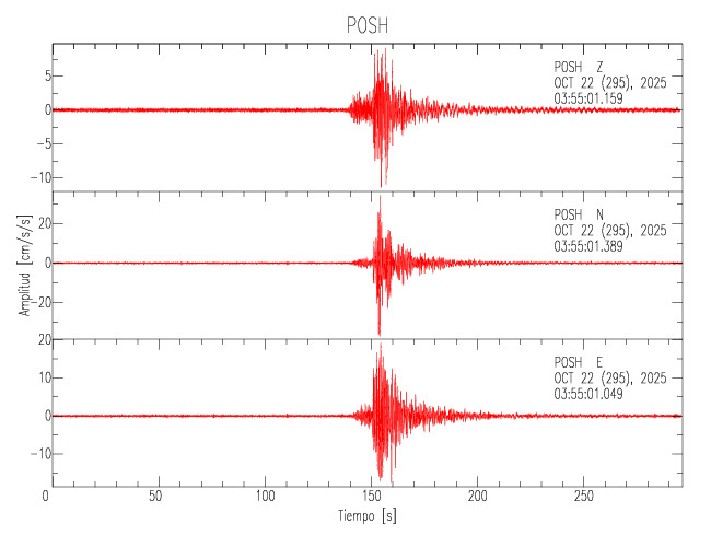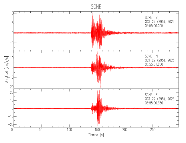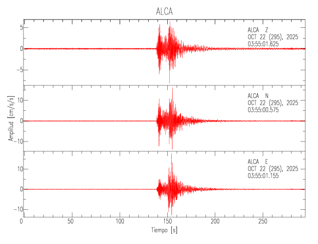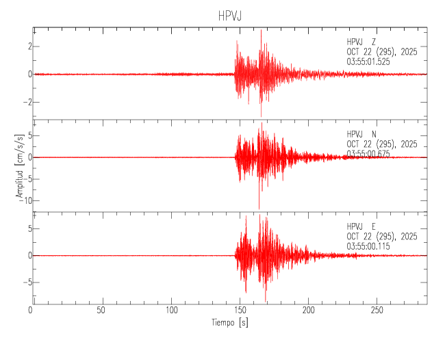 La siguiente tabla muestra los datos de aceleración máxima para cada componente en porcentaje de la aceleración de la gravedad (%g). Estos se obtienen dividiendo el valor del PGA registrado por 980 cm/s2 y multiplicándolo por 100. Los valores de las últimas dos columnas corresponden a la componente radial y transversal. Los datos se listan en orden descendente según el valor de la componente radial.