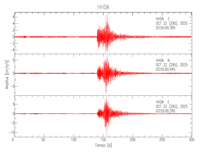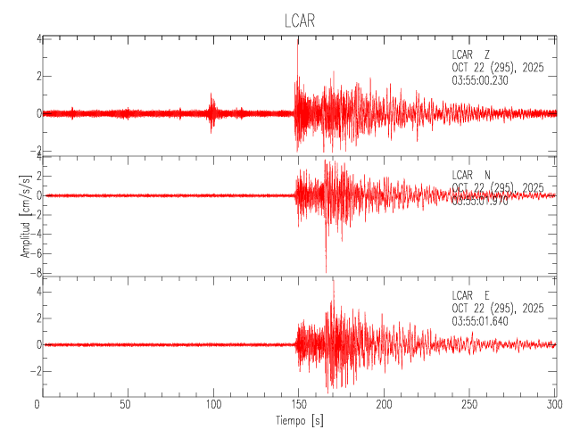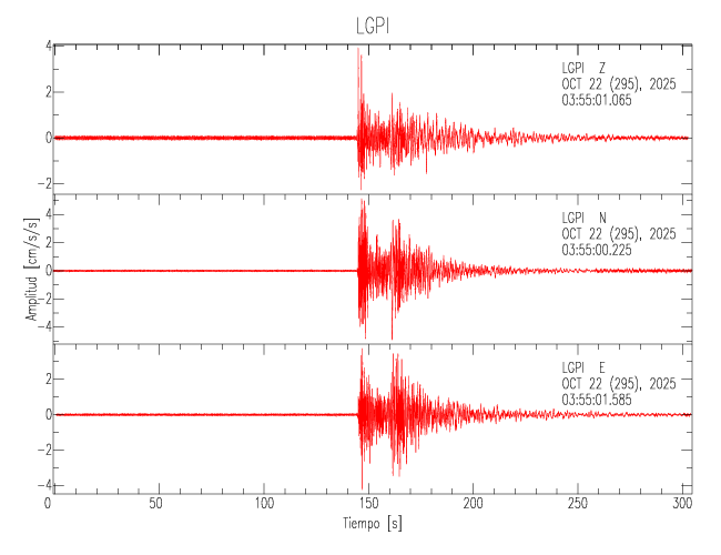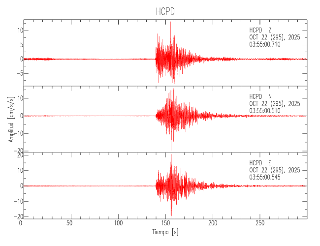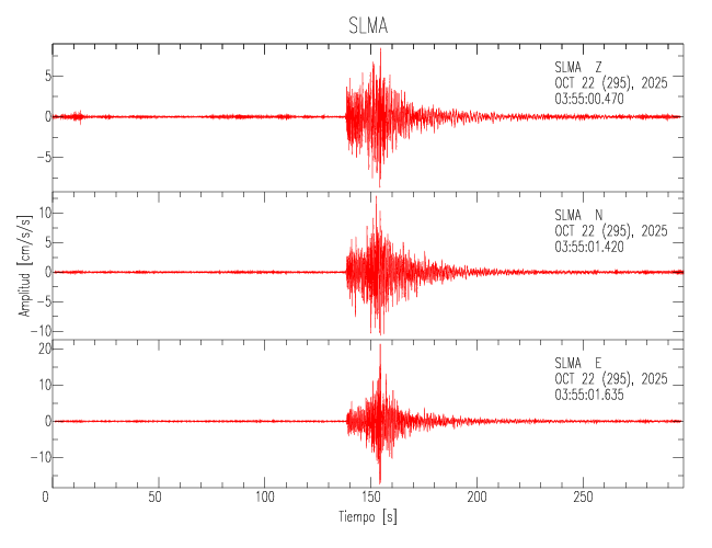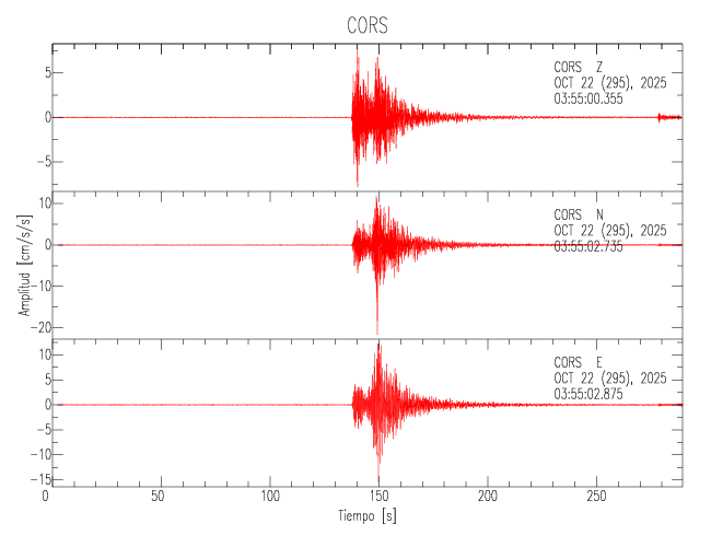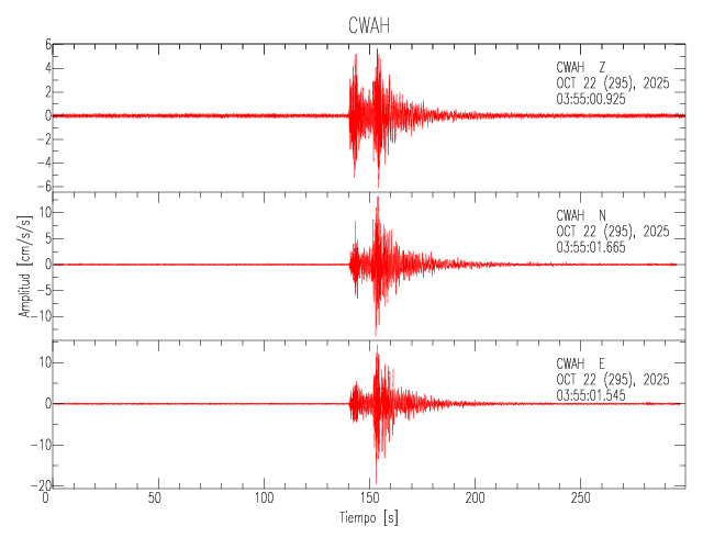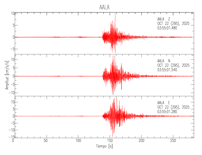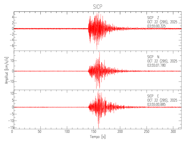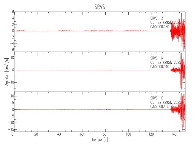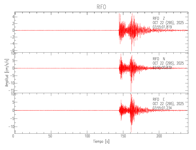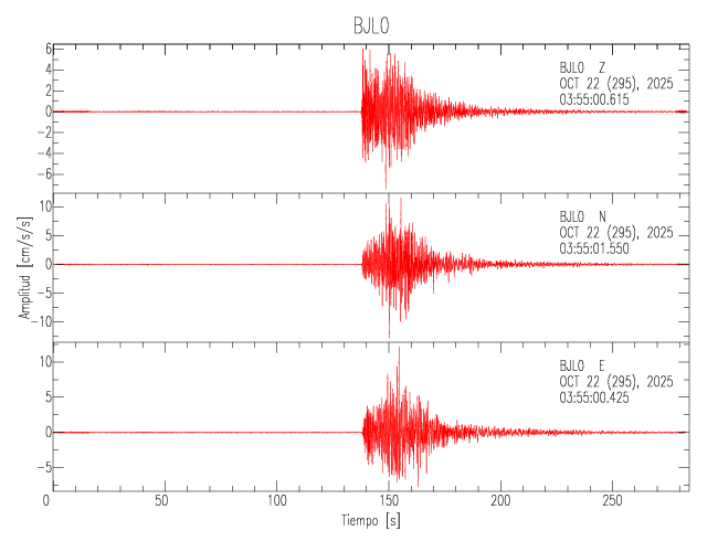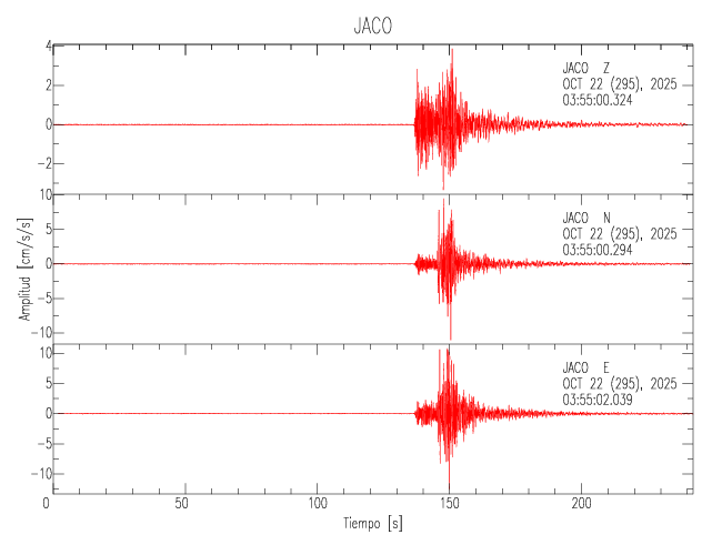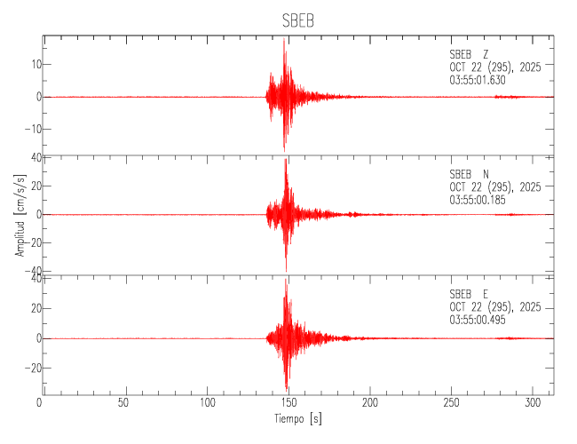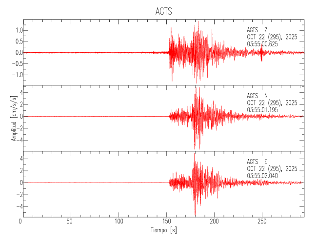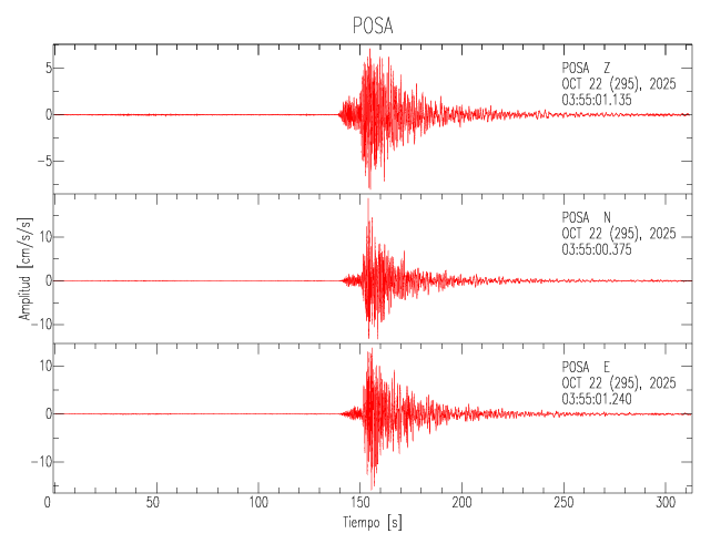 La siguiente tabla muestra los datos de aceleración máxima para cada componente en porcentaje de la aceleración de la gravedad (%g). Estos se obtienen dividiendo el valor del PGA registrado por 980 cm/s2 y multiplicándolo por 100. Los valores de las últimas dos columnas corresponden a la componente radial y transversal. Los datos se listan en orden descendente según el valor de la componente radial.