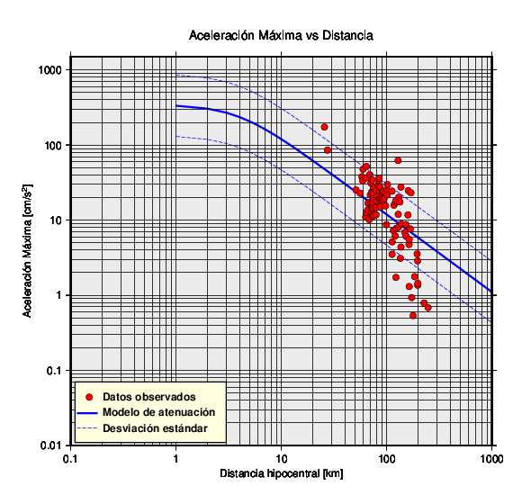 Datos del valor de la aceleración máxima (PGA por sus siglas en inglés) de cada estación (puntos rojos) en función de la distancia al hipocentro. Las trazas azules corresponden al modelo de atenuación y su respectiva desviación estándar.