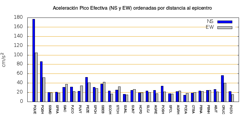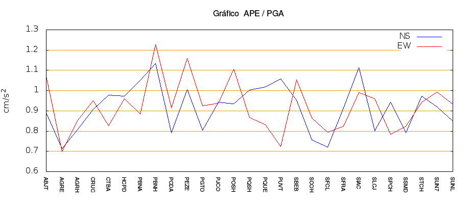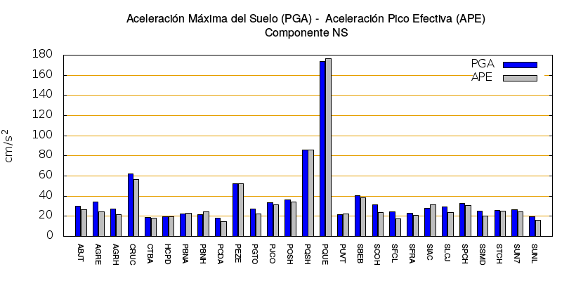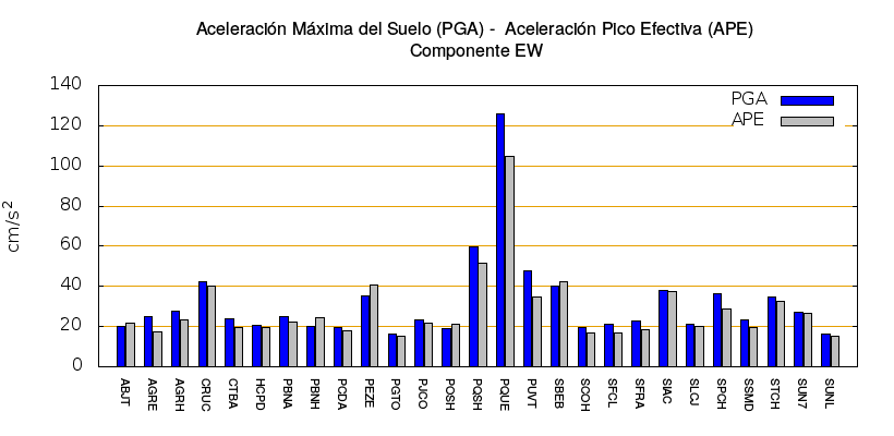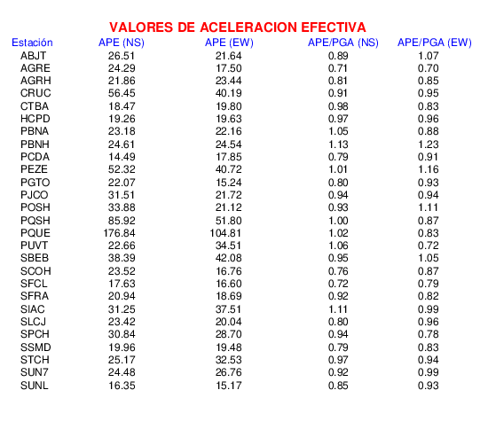 La siguiente tabla muestra los valores de aceleración efectiva para las componentes norte-sur (NS) y este-oeste (EW). También se muestra el valor del cociente entre la aceleración efectiva y la aceleración máxima (APE/PGA).