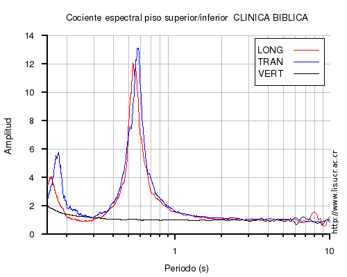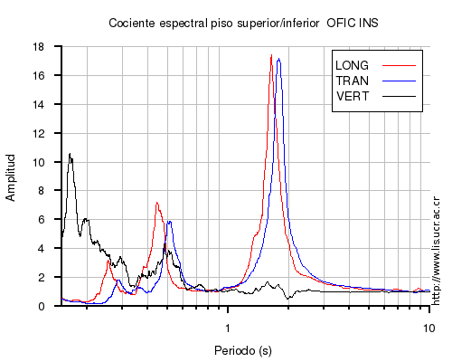 También se muestra el cociente espectral (en el rango de 0.1 a 10 s) entre el nivel superior (sea el último piso o la azotea) e inferior (sea el primero piso o el sótano) para cada una de las componentes LONG=longitudinal, TRAN=transversal y VERT=vertical. En los casos en que el nivel superior o inferior no estén disponibles al momento del sismo, se muestra una imagen con la leyenda "No se pudo calcular".