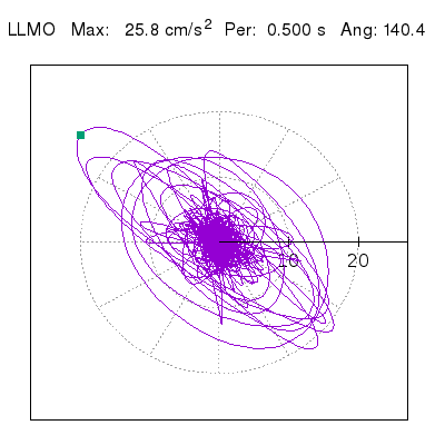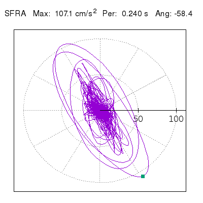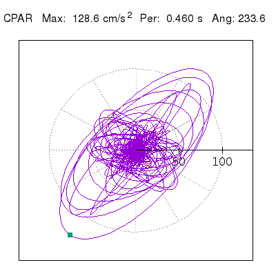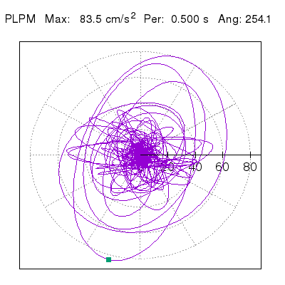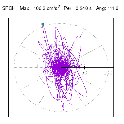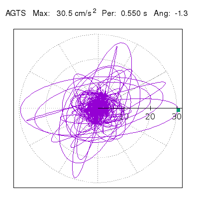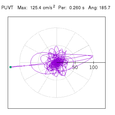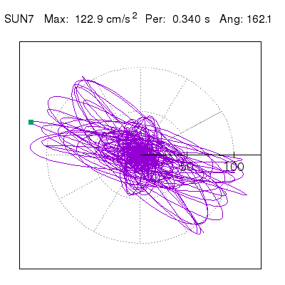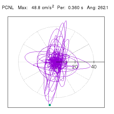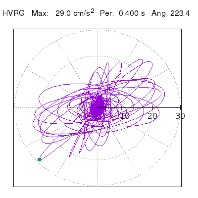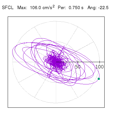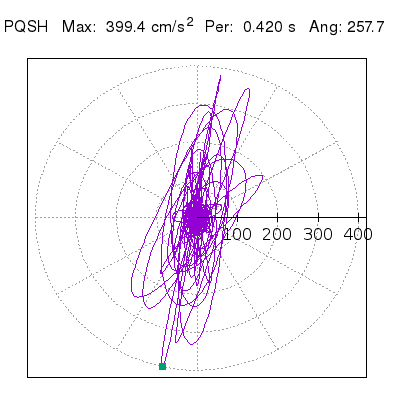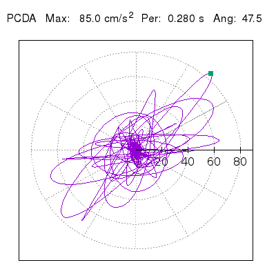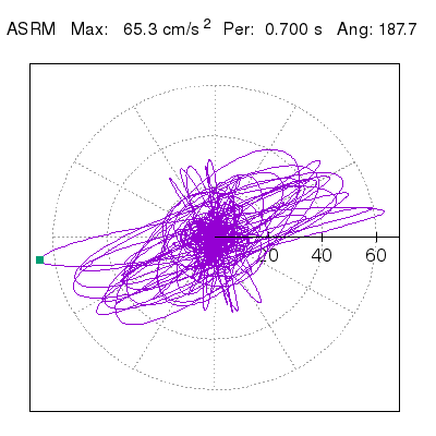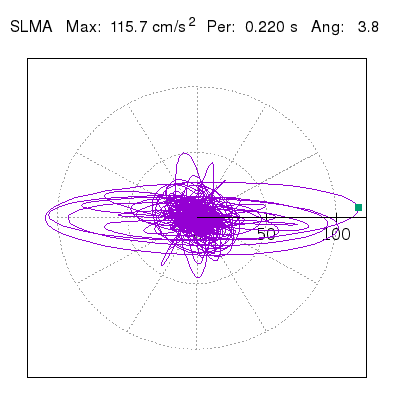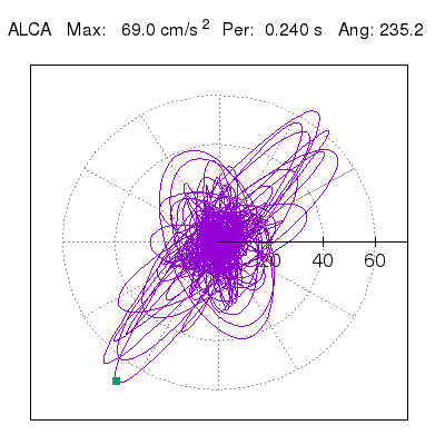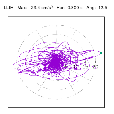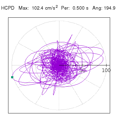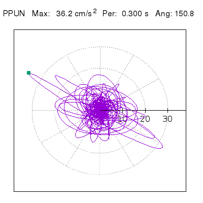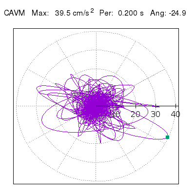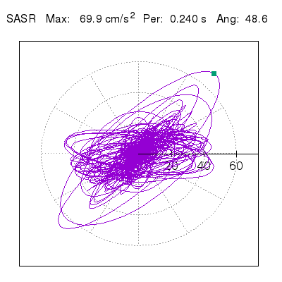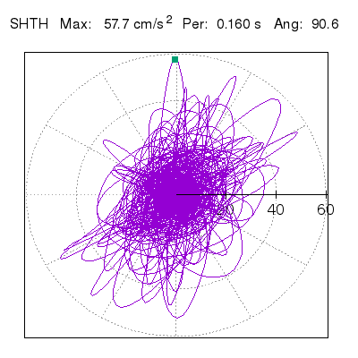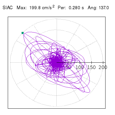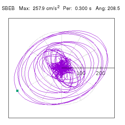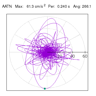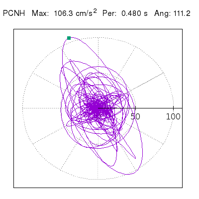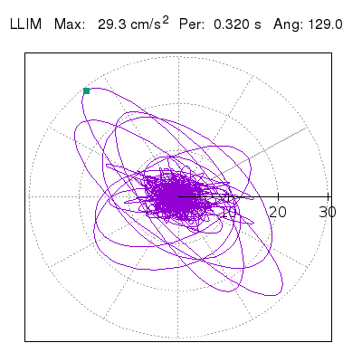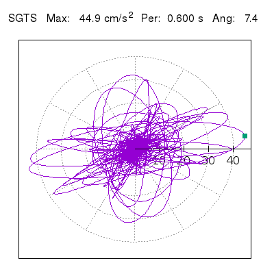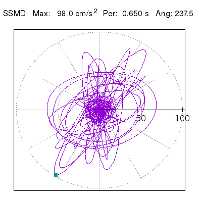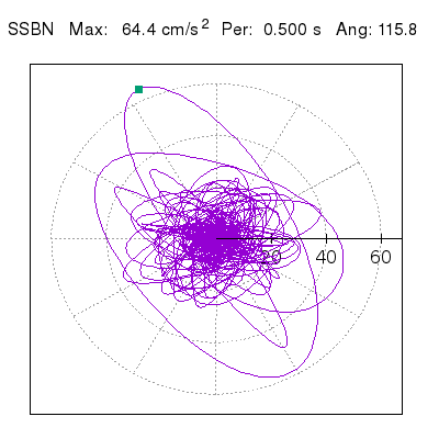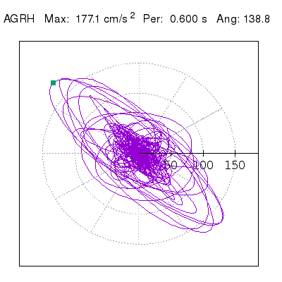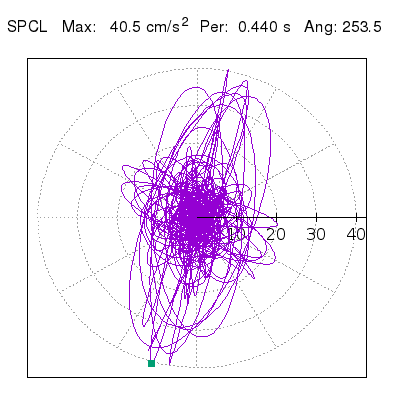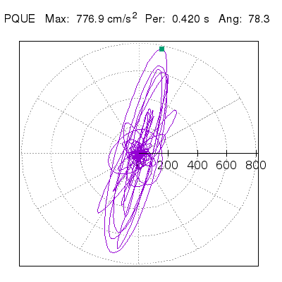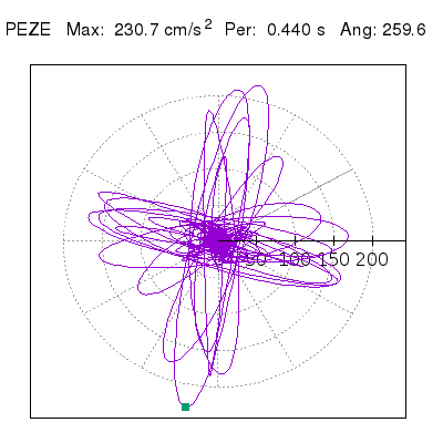 Tomando el periodo en el cual se presenta la amplitud máxima del espectro de respuesta máxima para cada estación, se representa la respuesta bidireccional en función del tiempo sobre el plano horizontal. Se identifica el punto (color verde en cada figura) del cual se desprende la orientación mostrada en el mapa de la sección superior. El valor de la acelereración máxima corresponde al punto del espectro de respuesta para el periodo indicado.