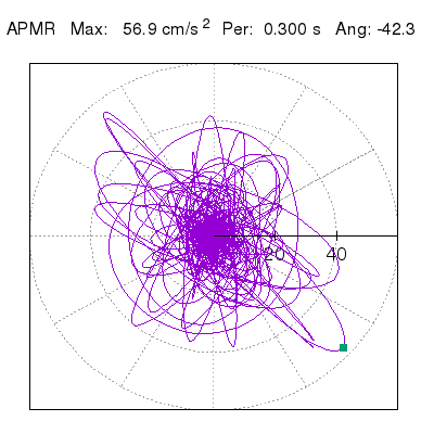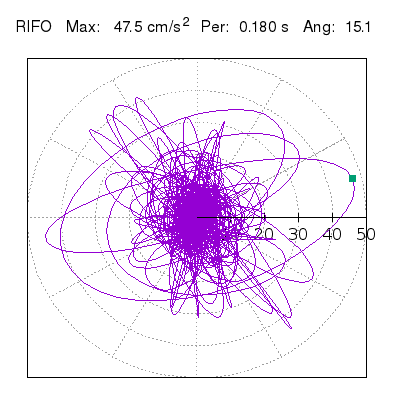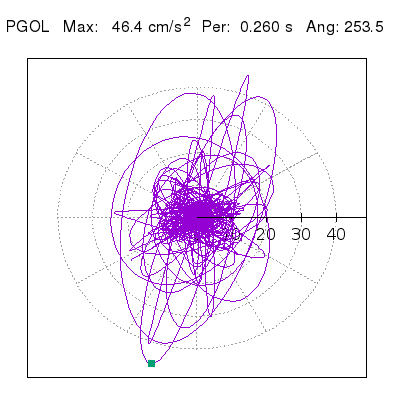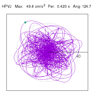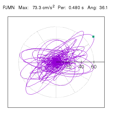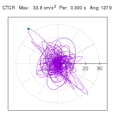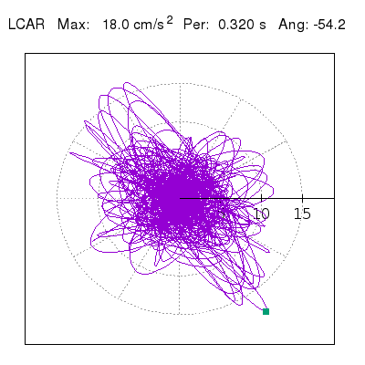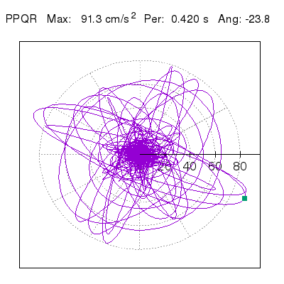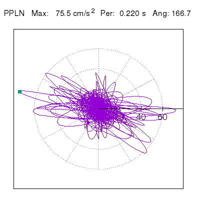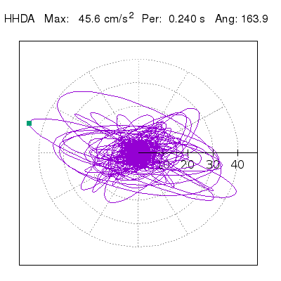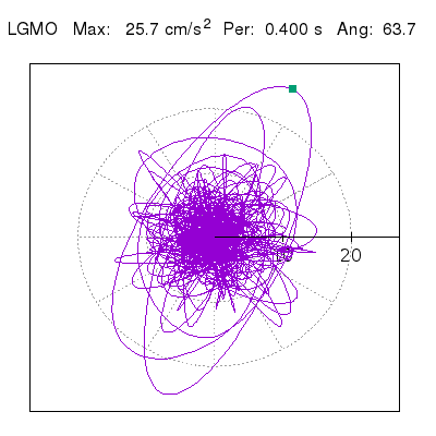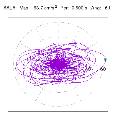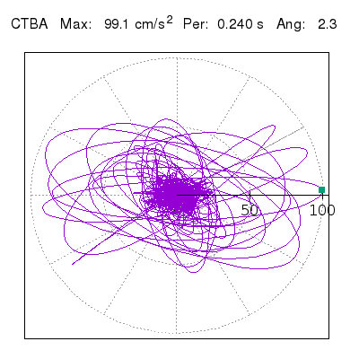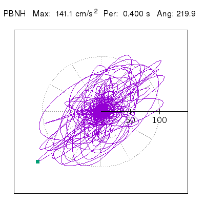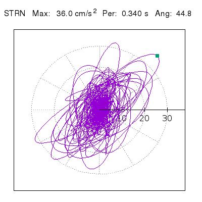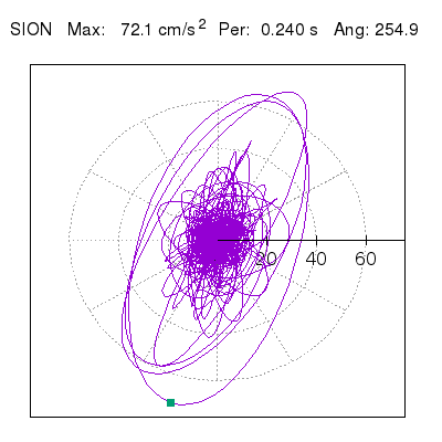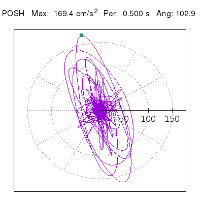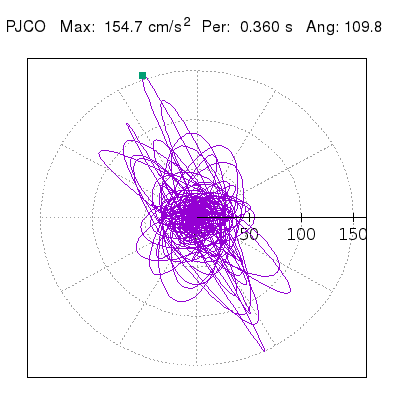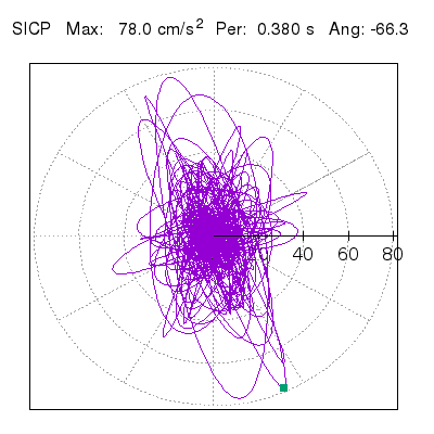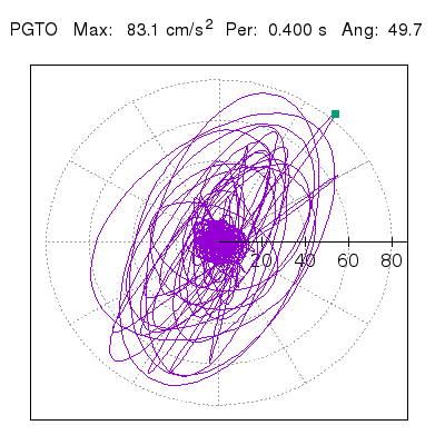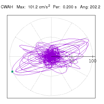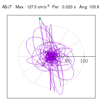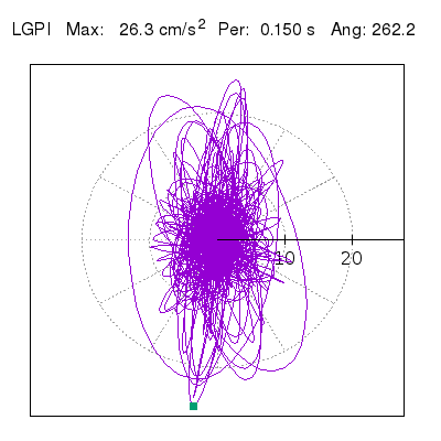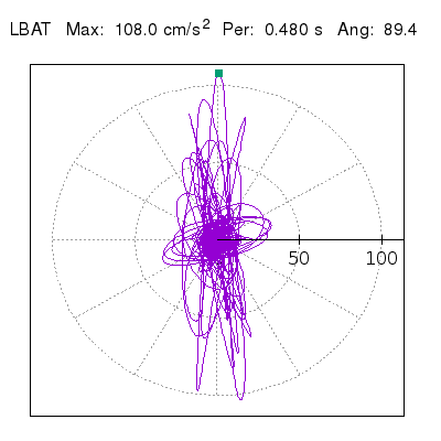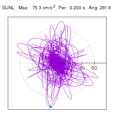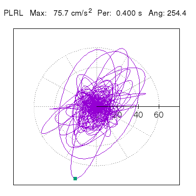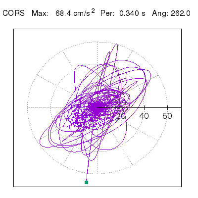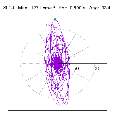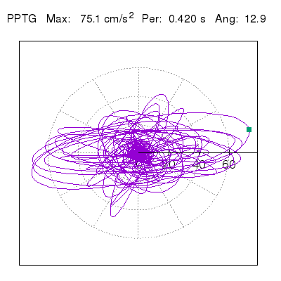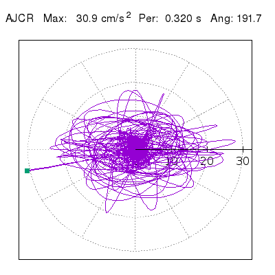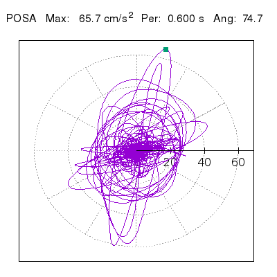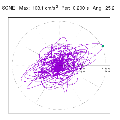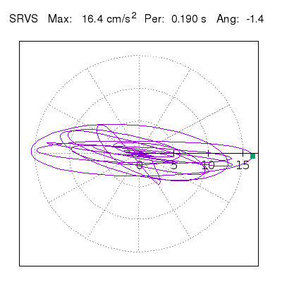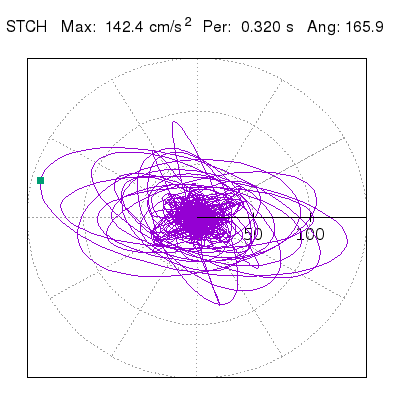 Tomando el periodo en el cual se presenta la amplitud máxima del espectro de respuesta máxima para cada estación, se representa la respuesta bidireccional en función del tiempo sobre el plano horizontal. Se identifica el punto (color verde en cada figura) del cual se desprende la orientación mostrada en el mapa de la sección superior. El valor de la acelereración máxima corresponde al punto del espectro de respuesta para el periodo indicado.