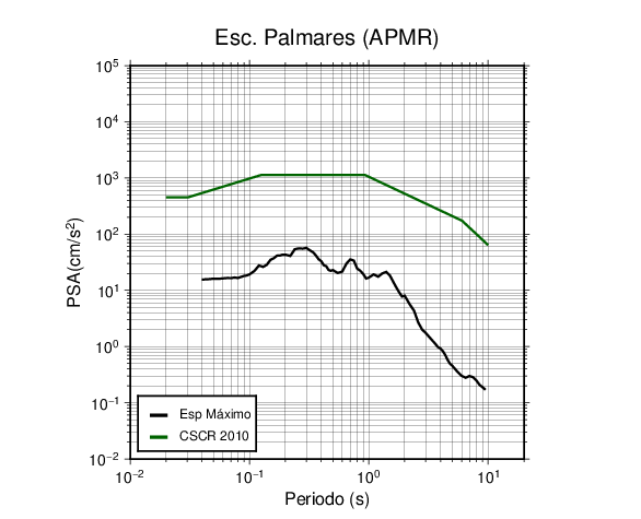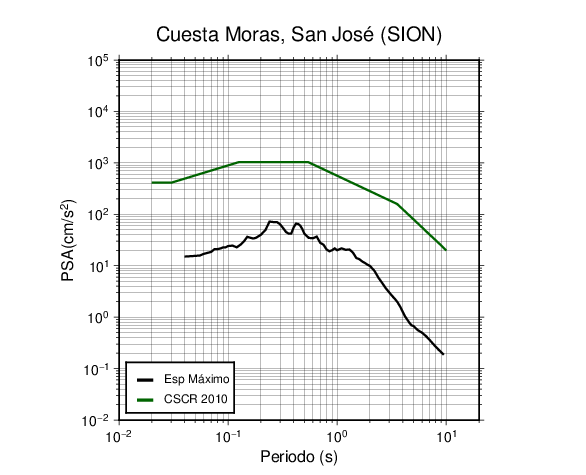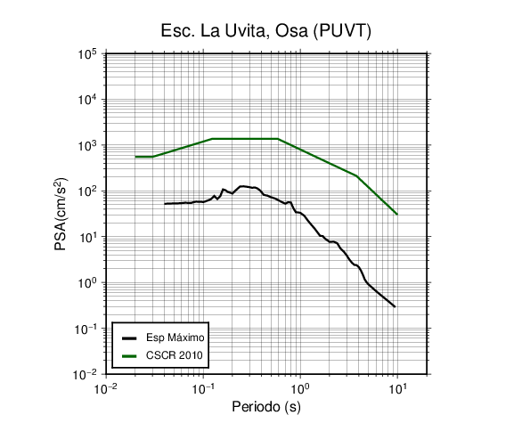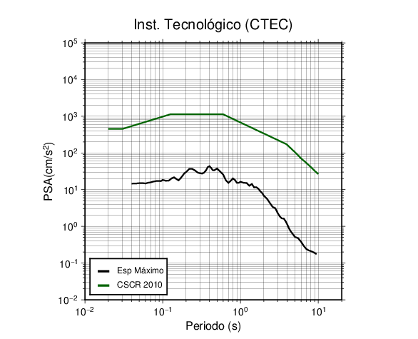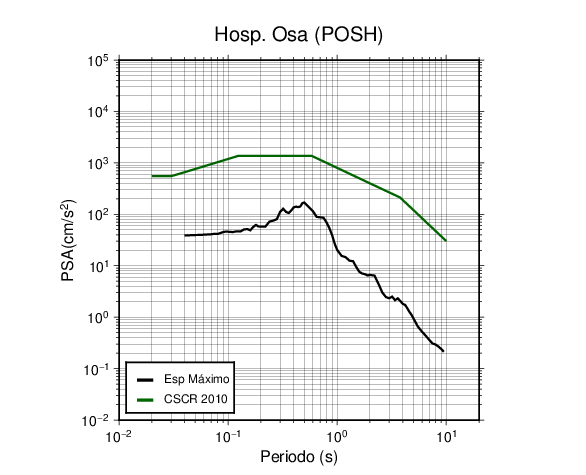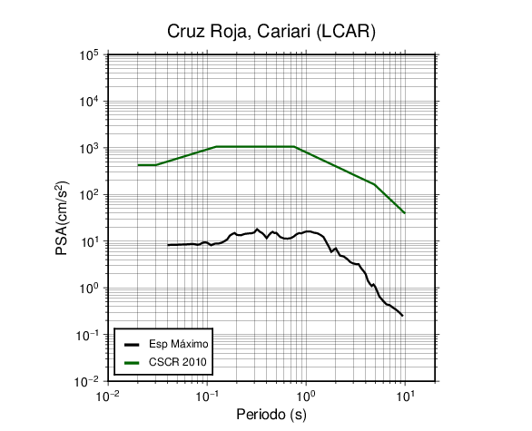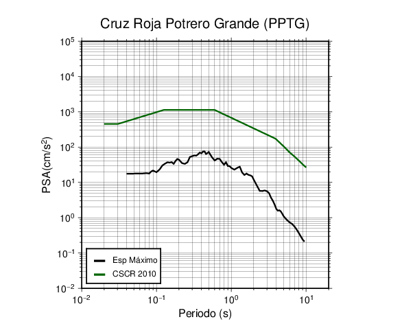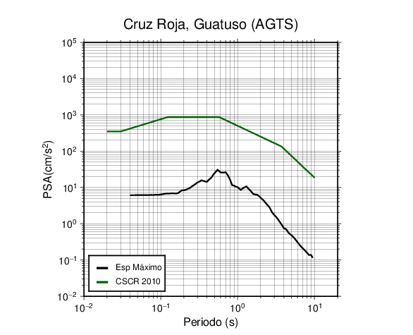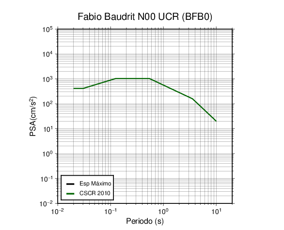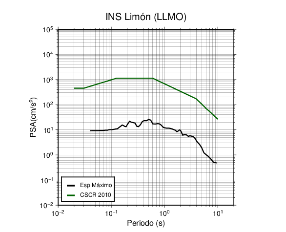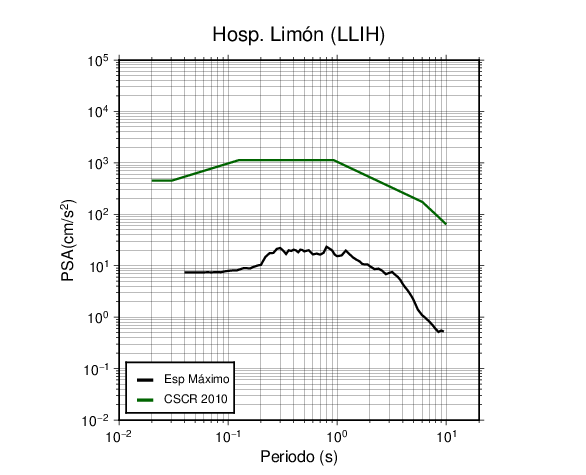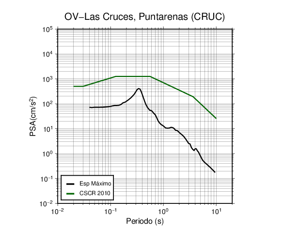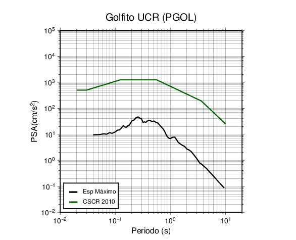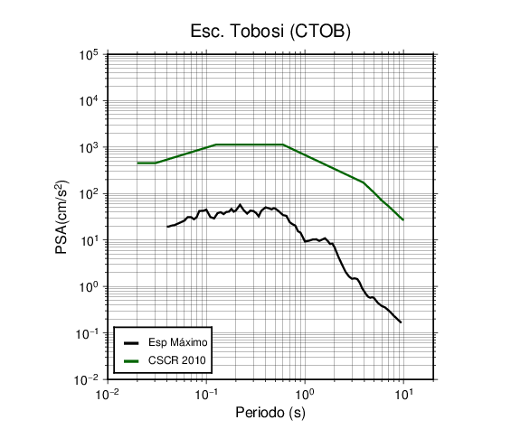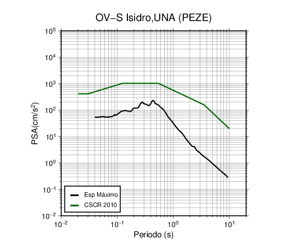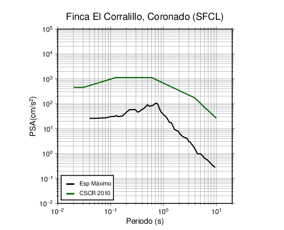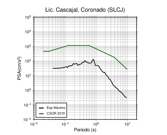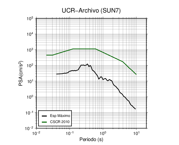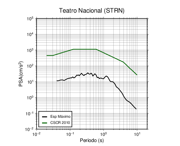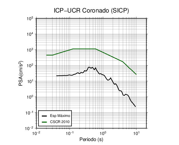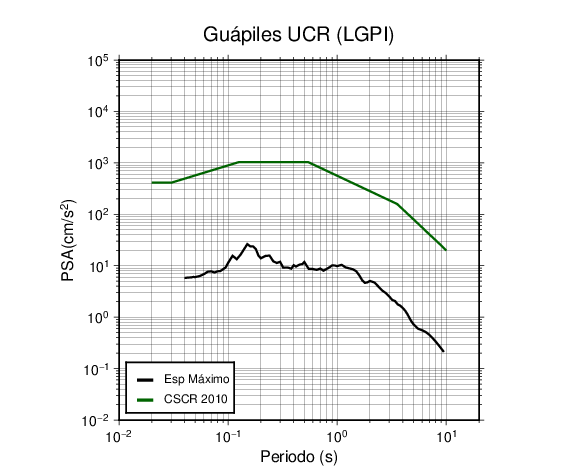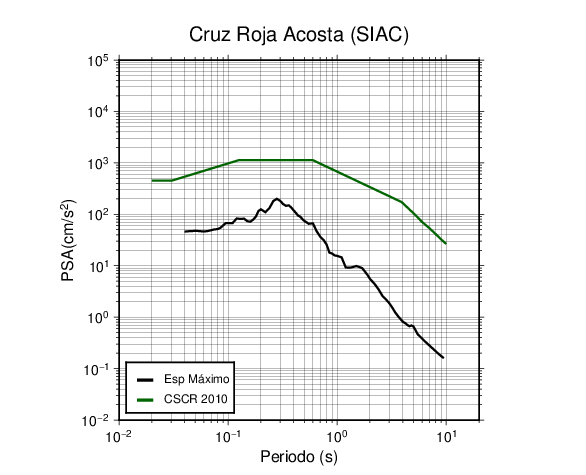En los siguientes gráficos, la traza verde es el espectro propuesto por el CSCR-2010, la traza negra es el espectro máximo de este sismo. El valor de la amplitud está dado en pseudoaceleración en cm/s2.