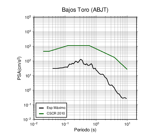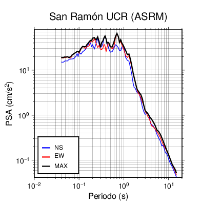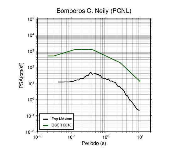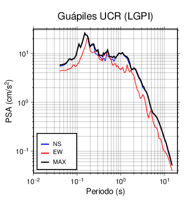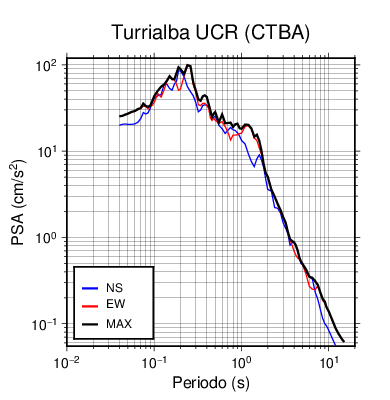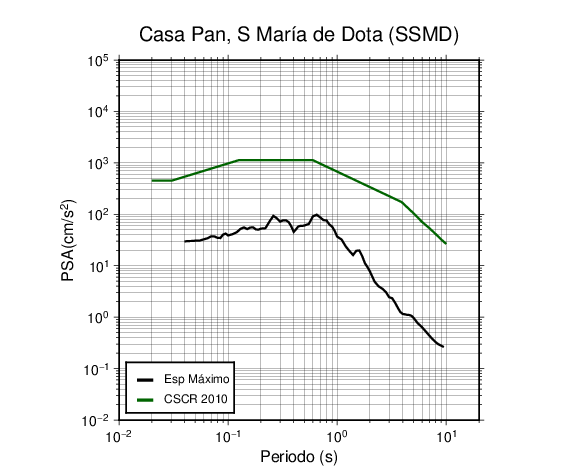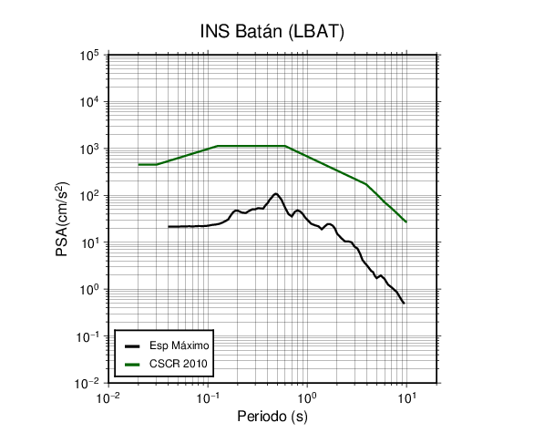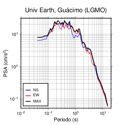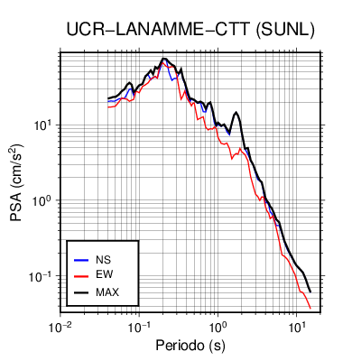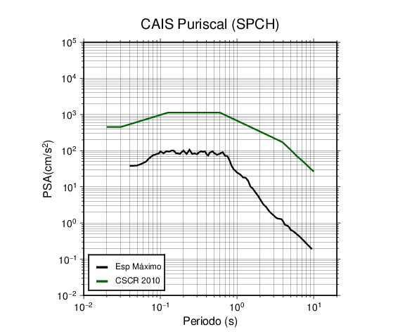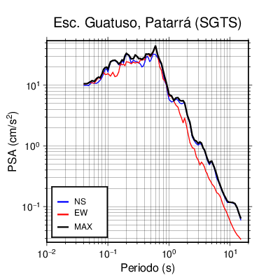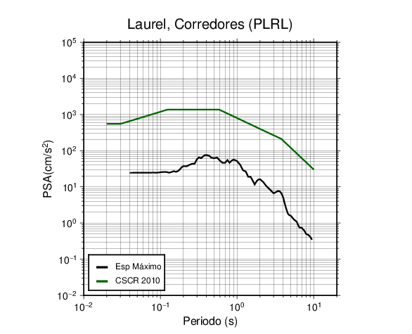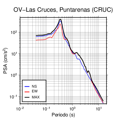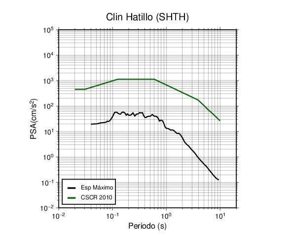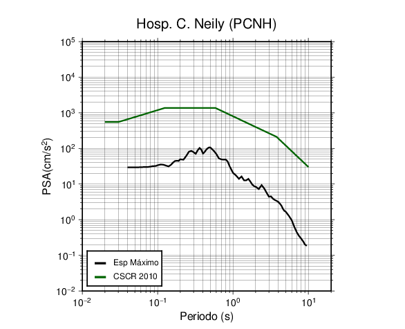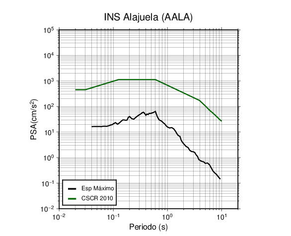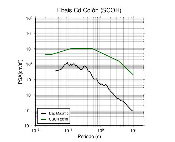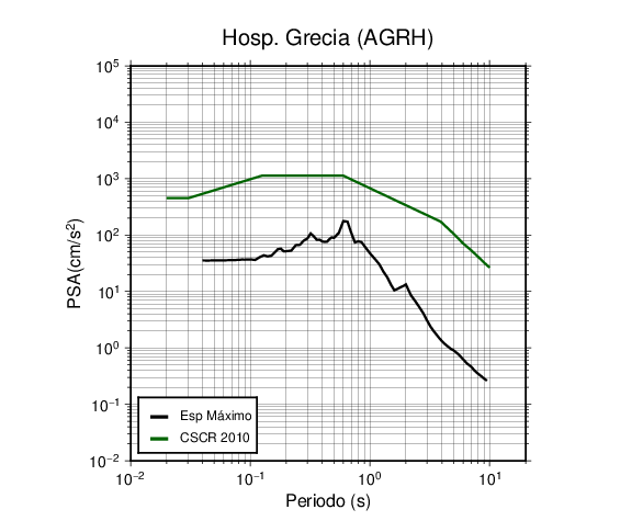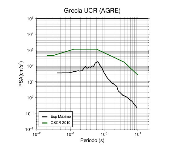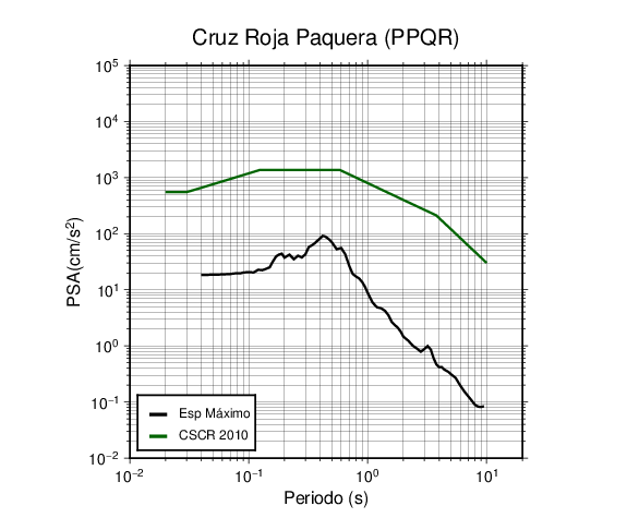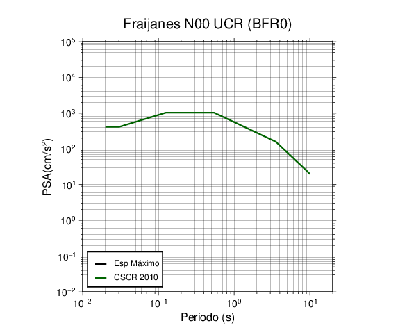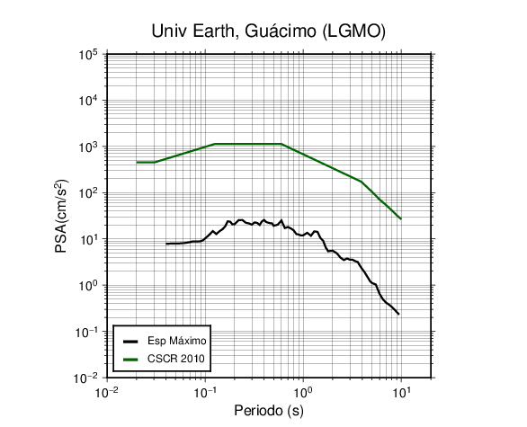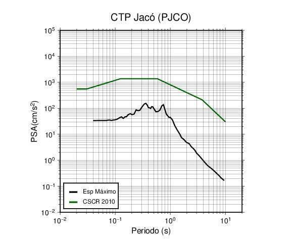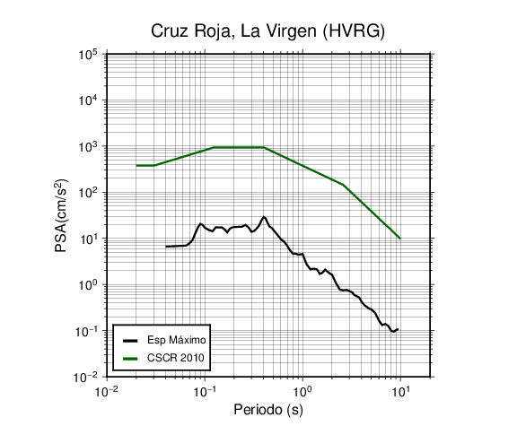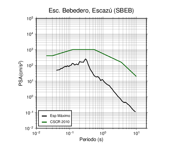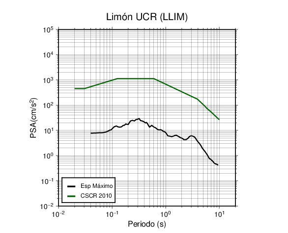 En los siguientes gráficos, la traza verde es el espectro propuesto por el CSCR-2010, la traza negra es el espectro máximo de este sismo. El valor de la amplitud está dado en pseudoaceleración en cm/s2.