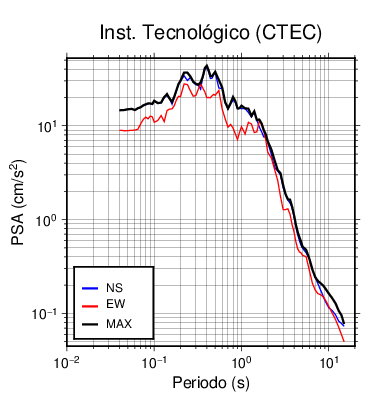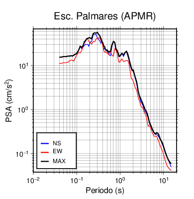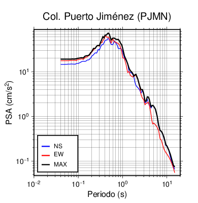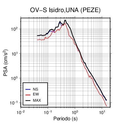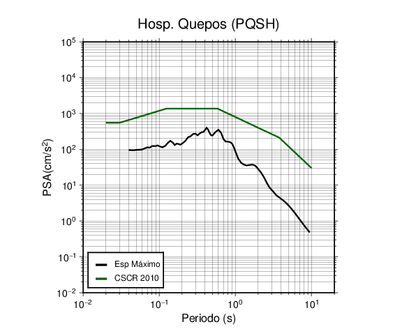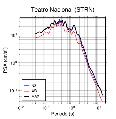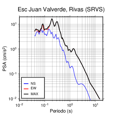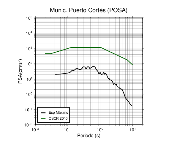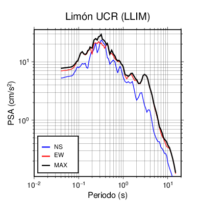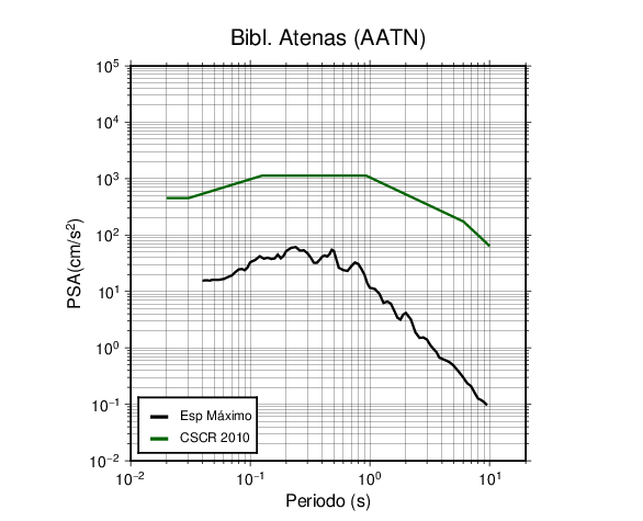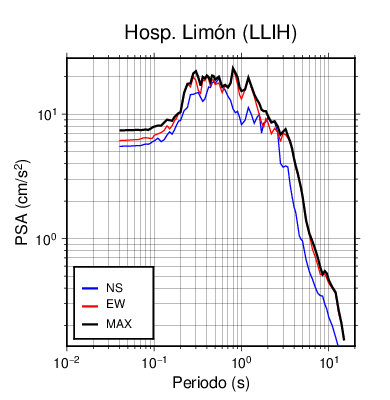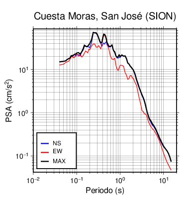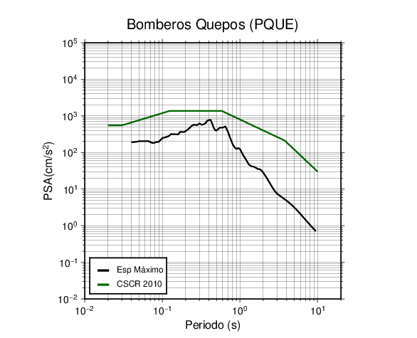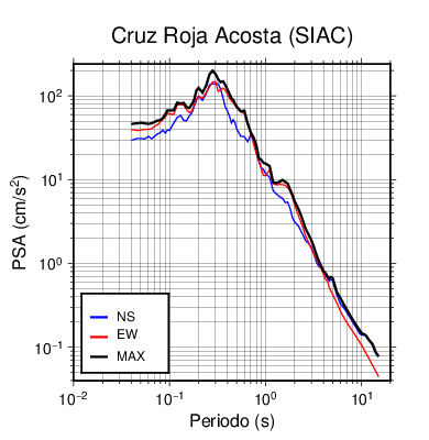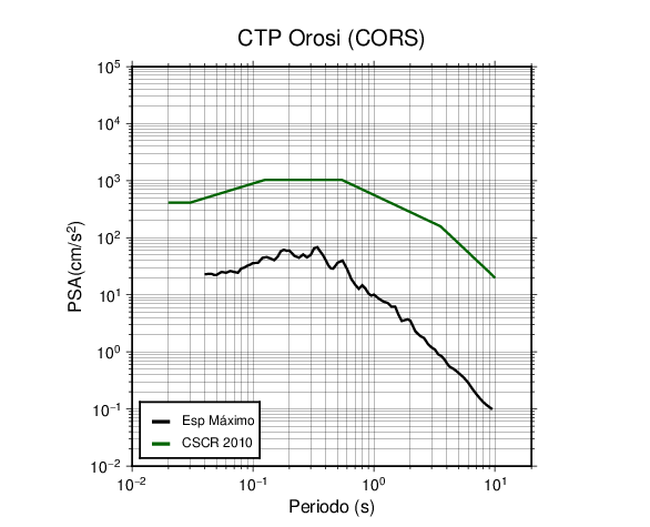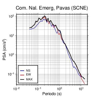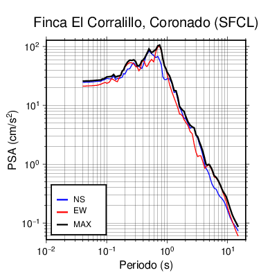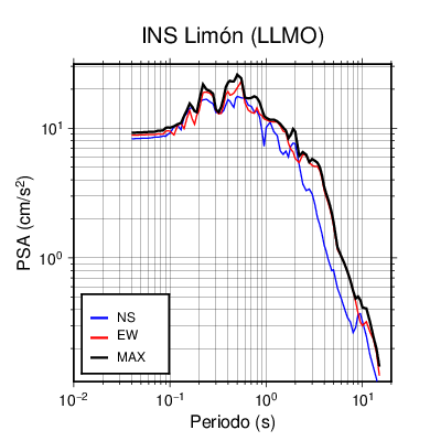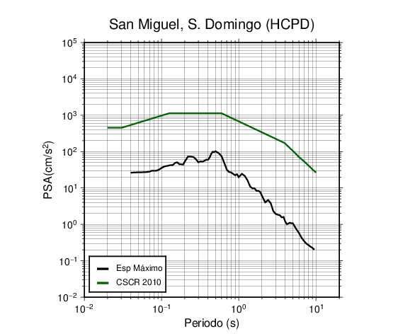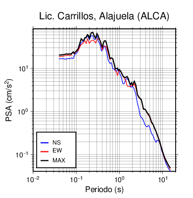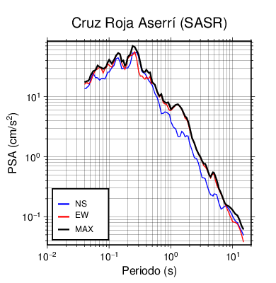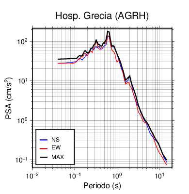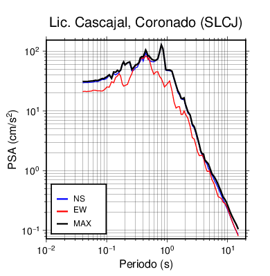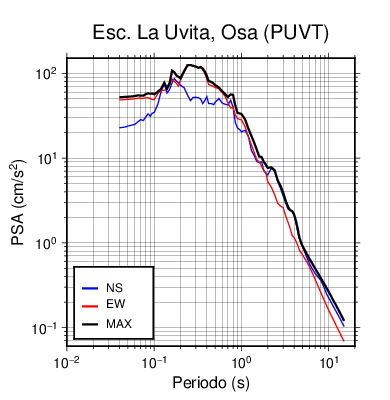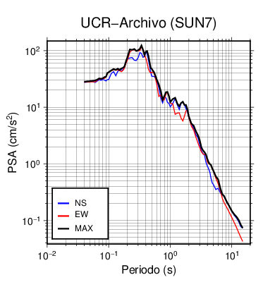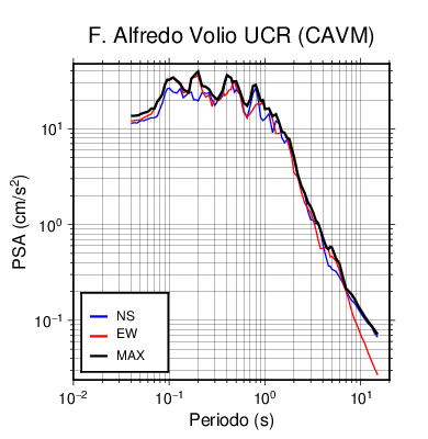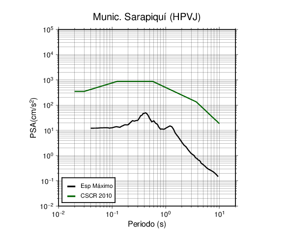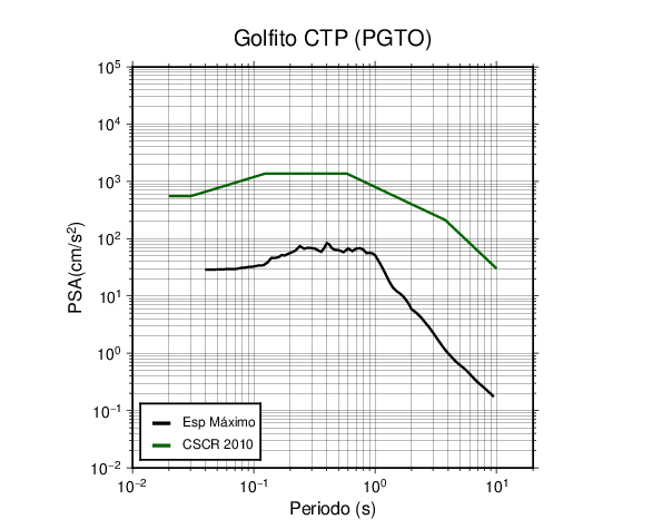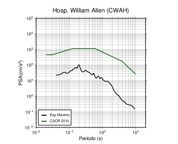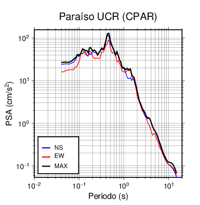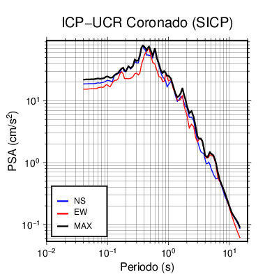 En los siguientes gráficos, la traza verde es el espectro propuesto por el CSCR-2010, la traza negra es el espectro máximo de este sismo. El valor de la amplitud está dado en pseudoaceleración en cm/s2.