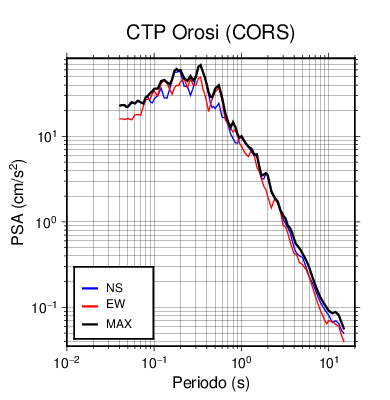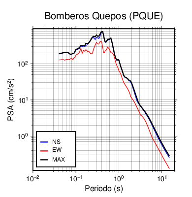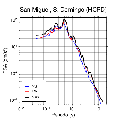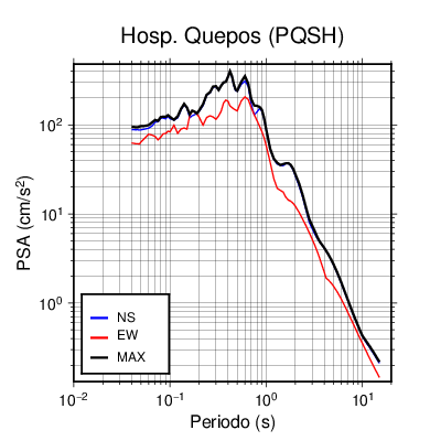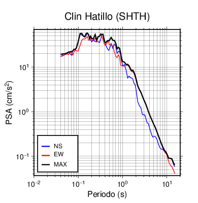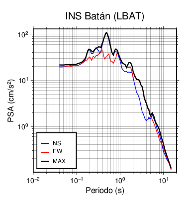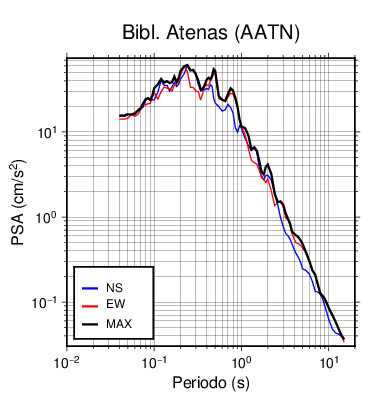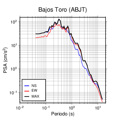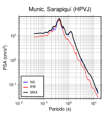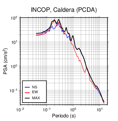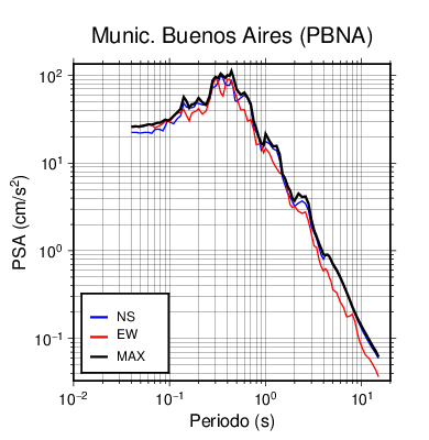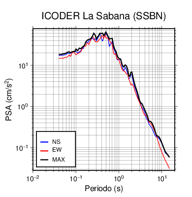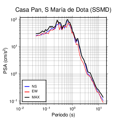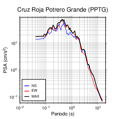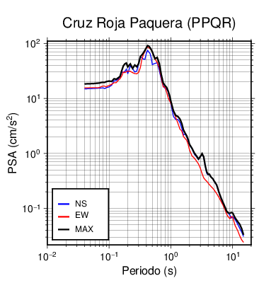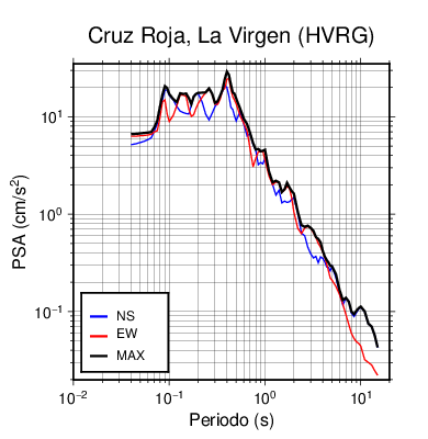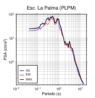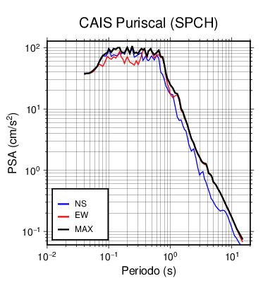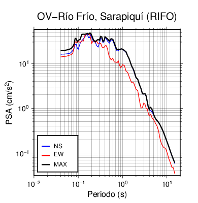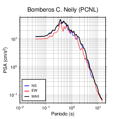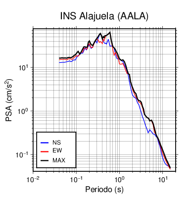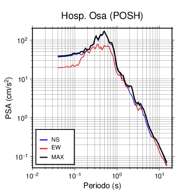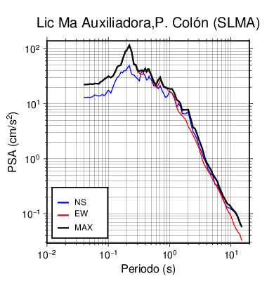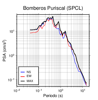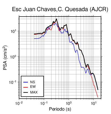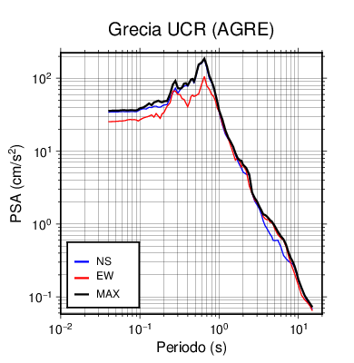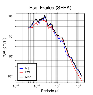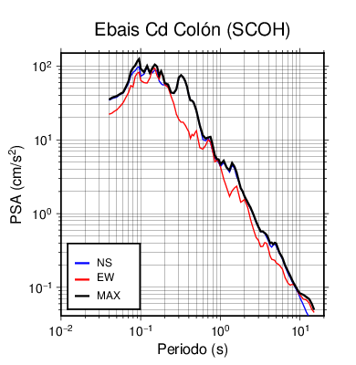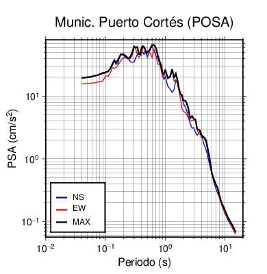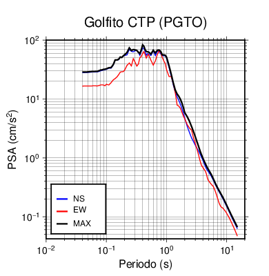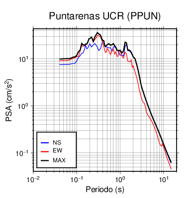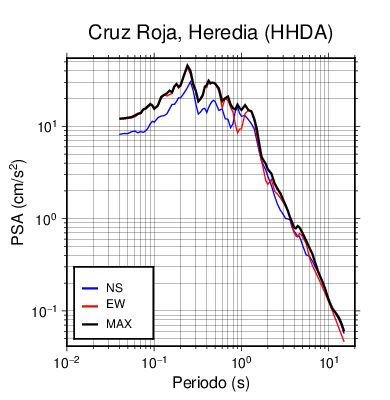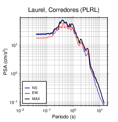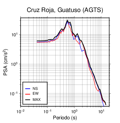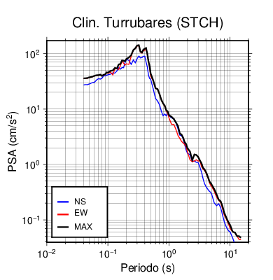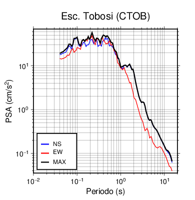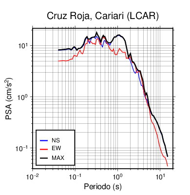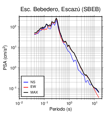 En los siguientes gráficos, la traza verde es el espectro propuesto por el CSCR-2010, la traza negra es el espectro máximo de este sismo. El valor de la amplitud está dado en pseudoaceleración en cm/s2.