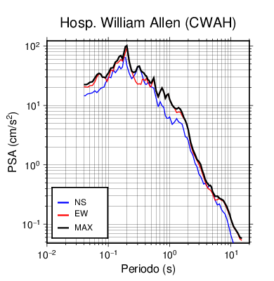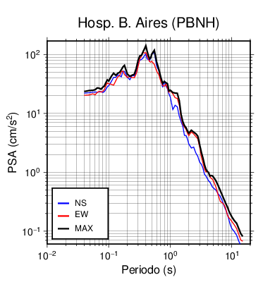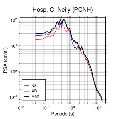 Los espectros de respuesta máxima siempre serán mayores o iguales a los espectros en las direcciones N-S y E-O. Se muestra la comparación para cada una de las estaciones en que se registró el evento.