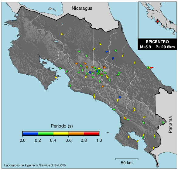 En este mapa se muestra el resultado del cálculo de la respuesta máxima en aceleraciones y su dirección para diferentes periodos de oscilación. Se determina el periodo en el que ocurre la máxima amplitud espectral y se muestra la orientación sobre el plano (indicado con la flecha). El periodo al cual ocurre dicho valor máximo se identifica mediante la escala de colores.