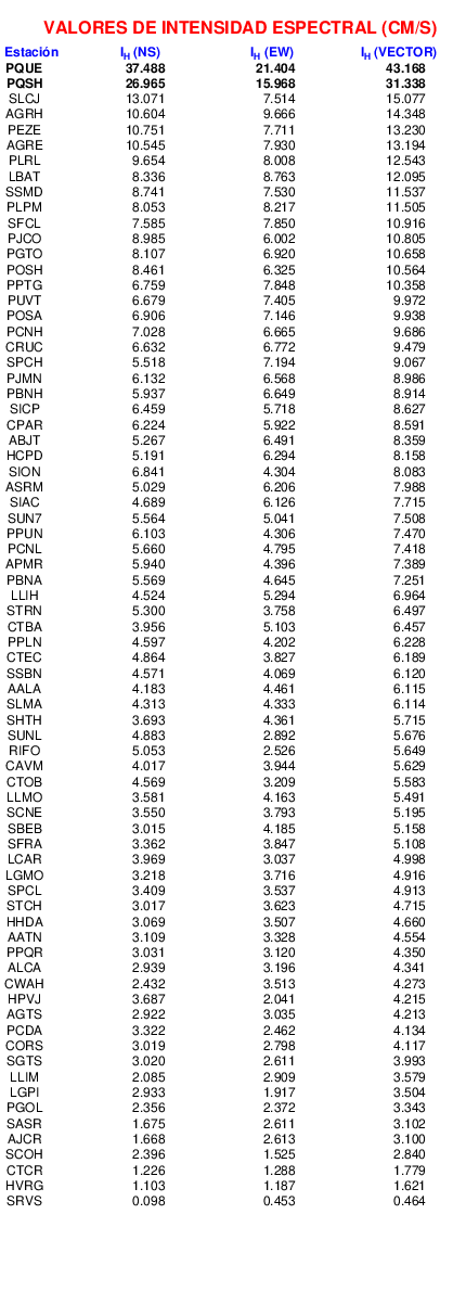 En esta sección se muestra el cáculo de la intensidad de Housner, IH para la componente norte-sur (NS) y este-oeste (EW) y la suma vectorial de los registros de aceleración que tuvieron valores superiores a los 5 cm/s2.