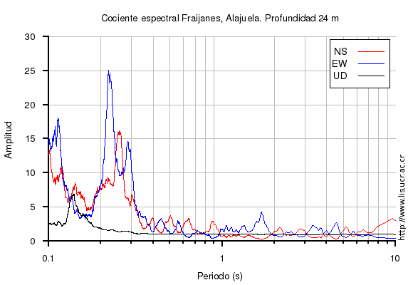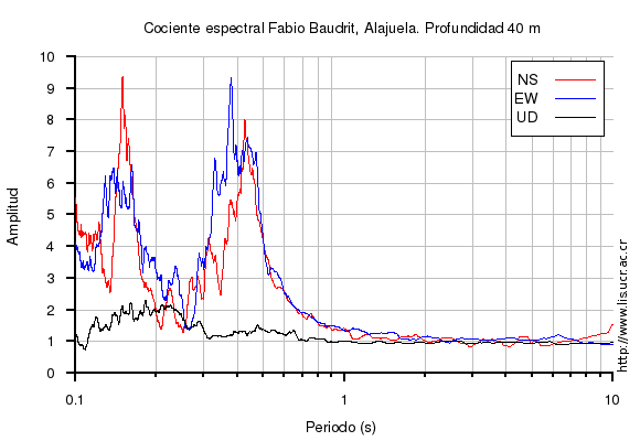 El cociente espectral se obtuvo dividiendo el espectro de amplitud de la componente en superficie con respecto a la componente en profundidad (NS=norte-sur, EW=este-oeste, UD=vertical)