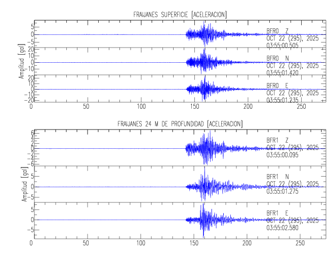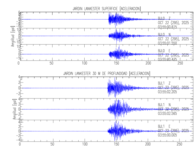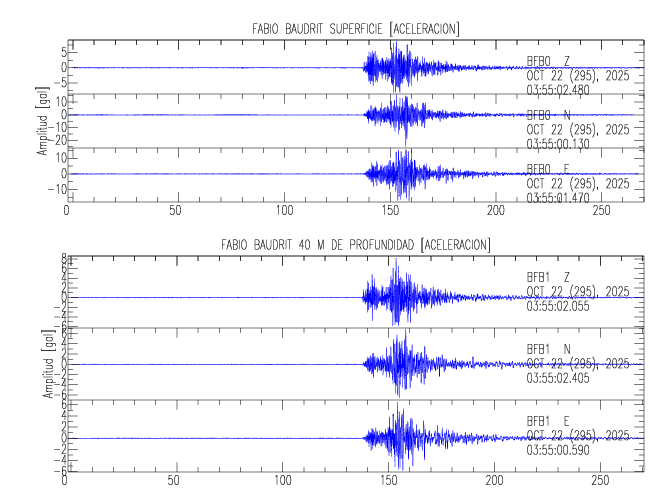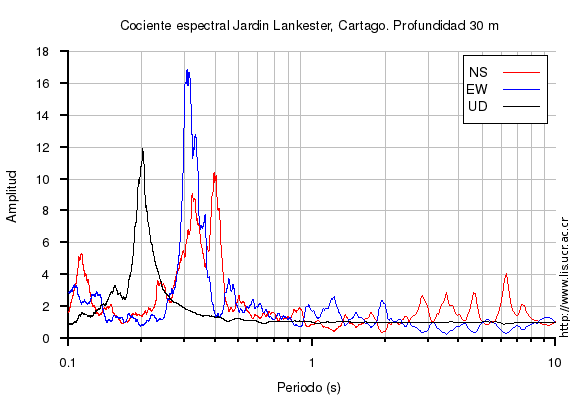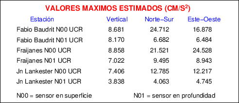 Aquí se muestran las formas de onda y cocientes espectrales de los sensores colocados en pozo . Uno se ubica en el Jardín Lankester en Paraíso de Cartago con 30 m de profundidad y el otro en la Estación Experimental Fabio Baudrit en Alajuela con 40 m de profundidad. La tabla muestra los valores de aceleración máxima (PGA) leídos de las tres componentes en superficie (N00) y en profundidad (N01)