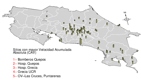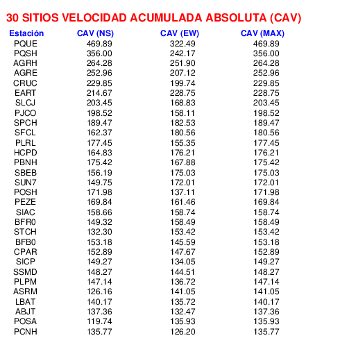 La velocidad acumulada absoluta (CAV por sus siglas en inglés) es otro parámetro que se usa para caracterizar el movimiento fuerte del suelo. Los datos están dados en cm/s para las componentes norte-sur (NS) y este-oeste (EW). El máximo de ambas se da en la tercera columna.