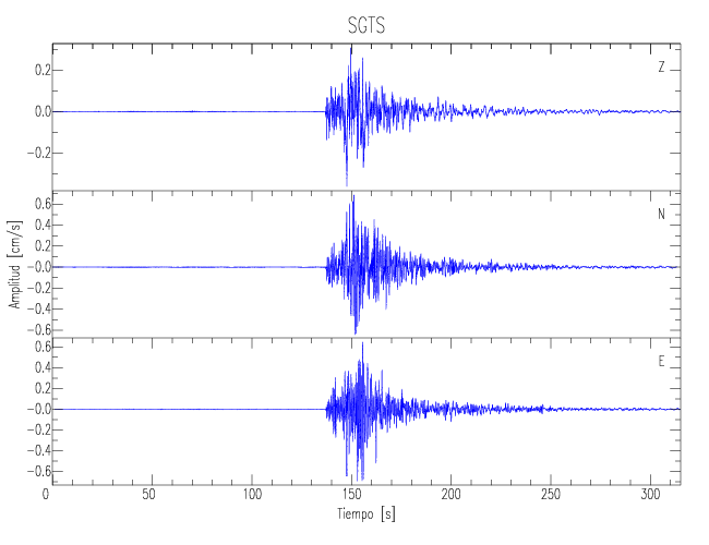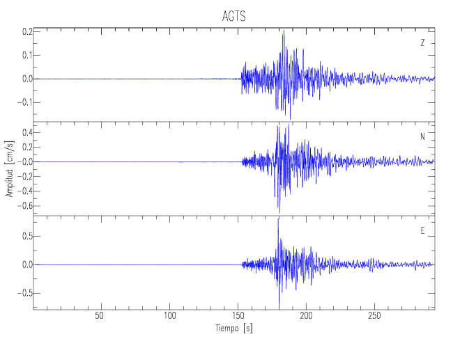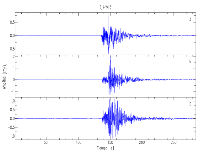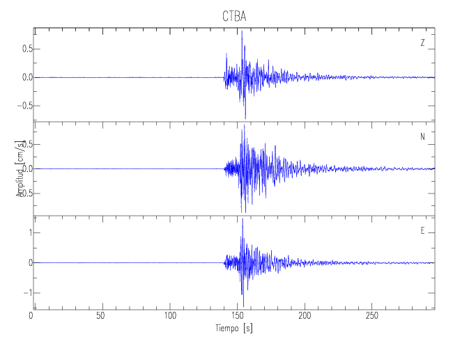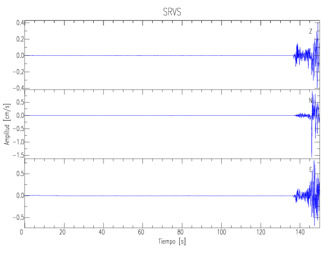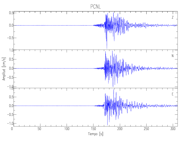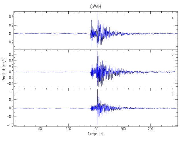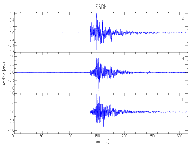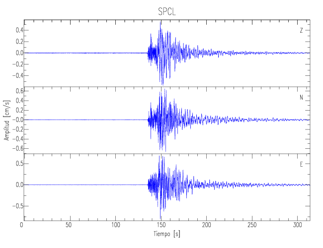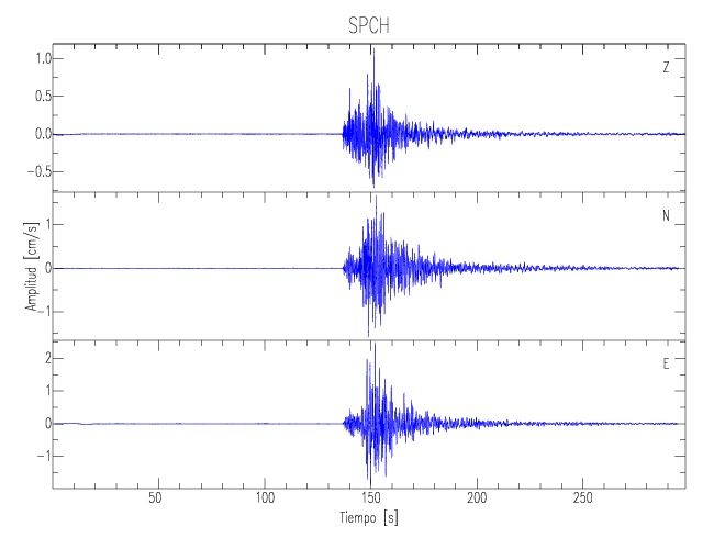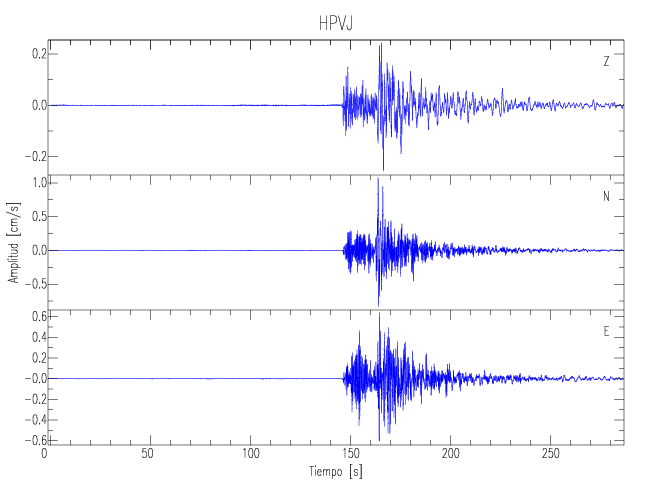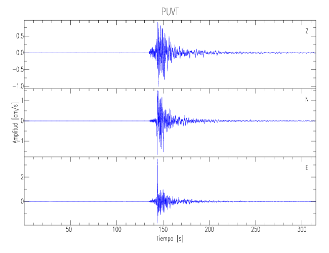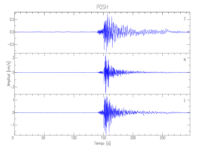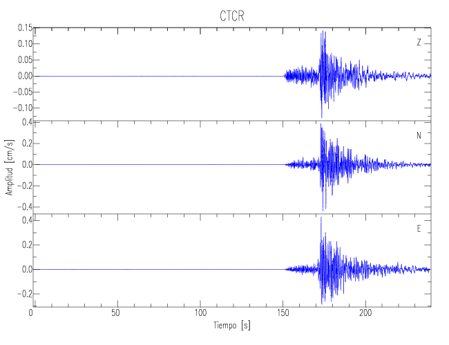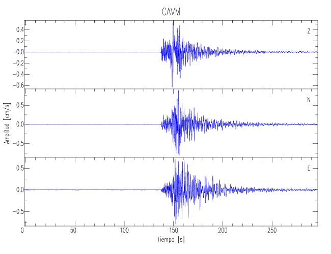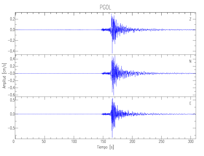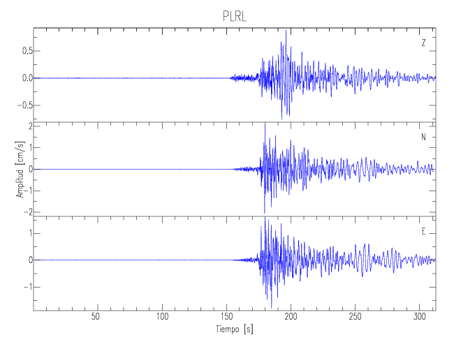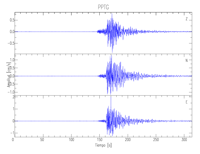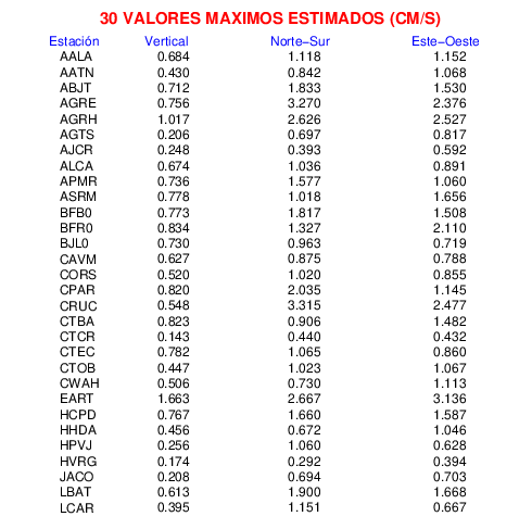 Los registros de velocidad se obtienen de la integración de los datos de aceleración. Esta tabla contiene los valores de velocidad máxima (PGV por sus siglas en inglés) para cada componente en cm/s. Las estaciones se listan en orden alfabético y corresponden a los sitios en que el nivel de aceleración fue superior a los 5 cm/s2.