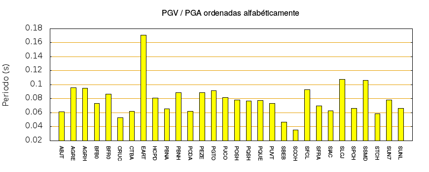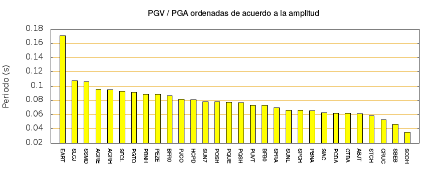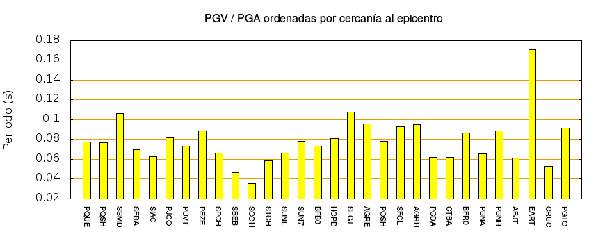 El cociente de la velocidad máxima (PGV) entre la aceleración máxima (PGA) brinda información de los periodos más significativos del movimiento del suelo. En el gráfico siguiente se muestran las estaciones ordenadas por su cercanía al epicentro. La más cercana está a la izquierda y la más lejana a la derecha. También se muestran los mismos datos en orden alfabético y ordenados de mayor a menor amplitud.