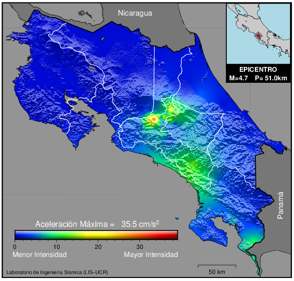 Los datos de aceleración máxima registrada se interpolan para obtener un mapa de isoaceleraciones. En el se puede ver la tendencia general de la amplificación de todo el país a partir del lugar en que el movimiento fue más intenso.