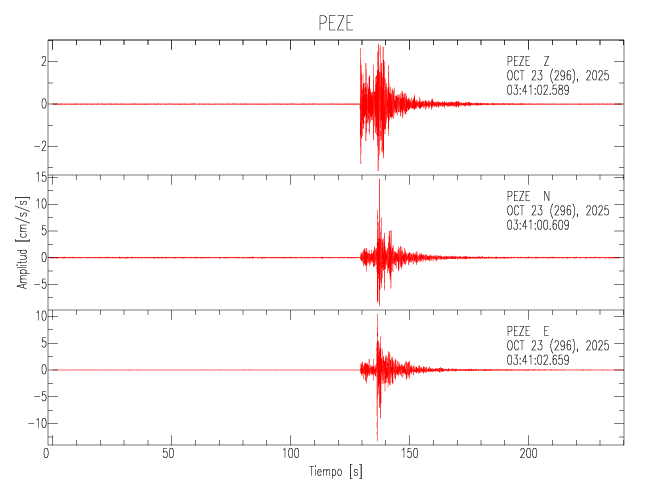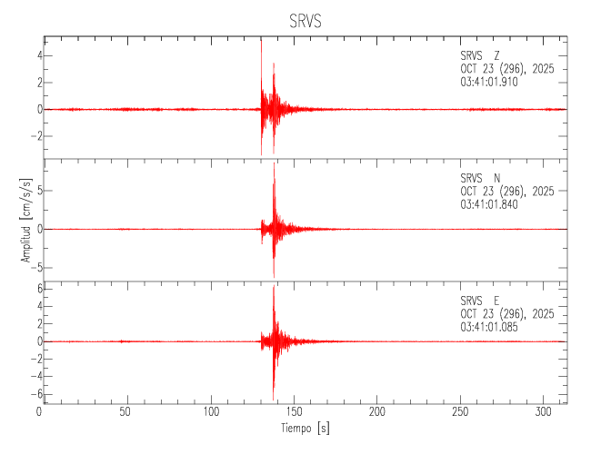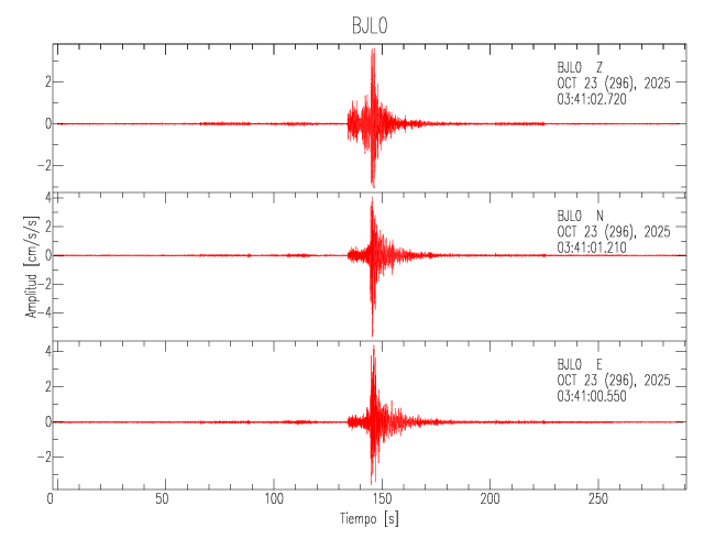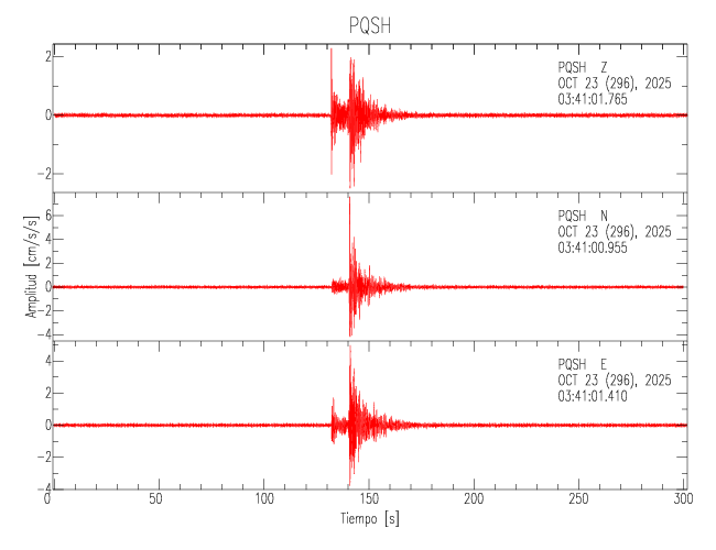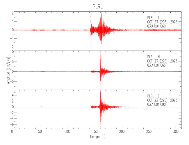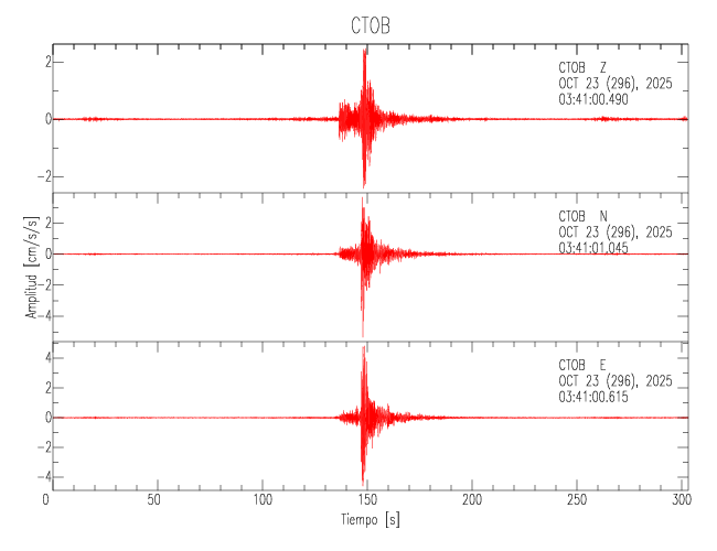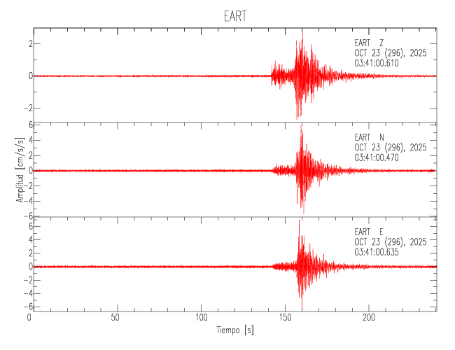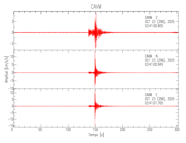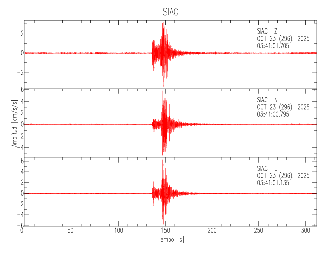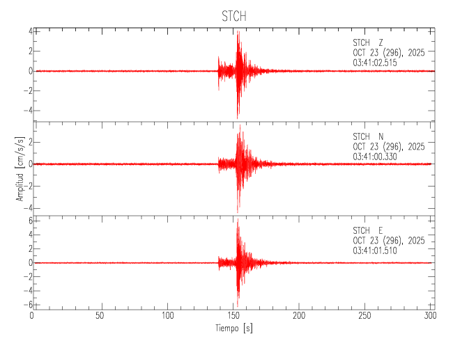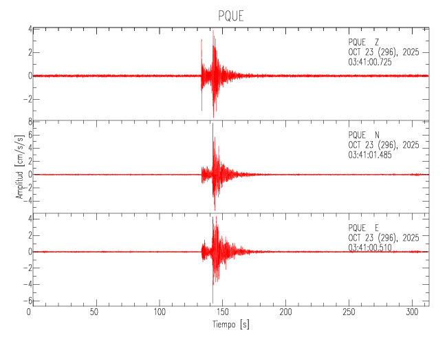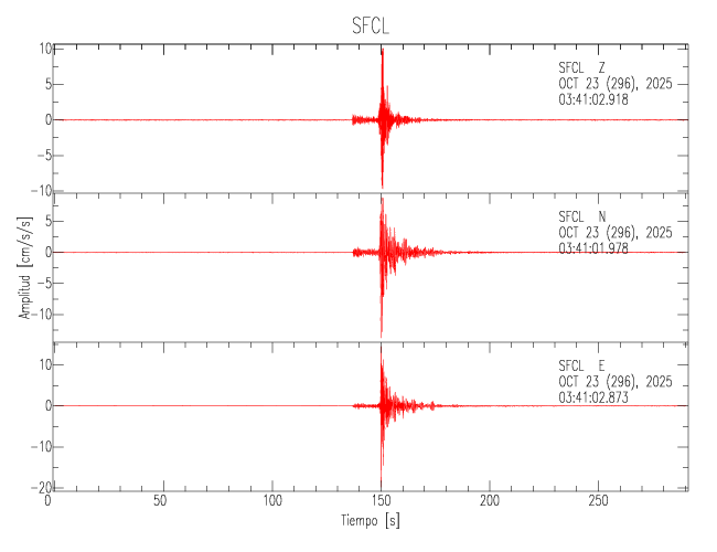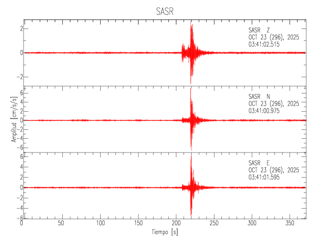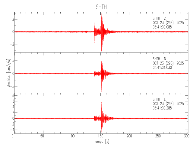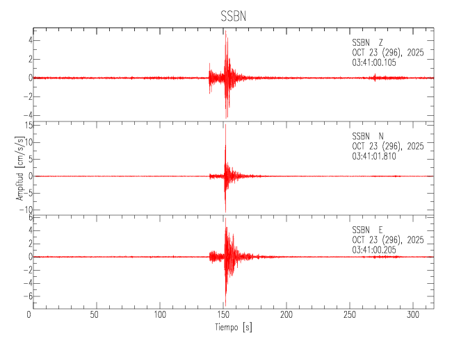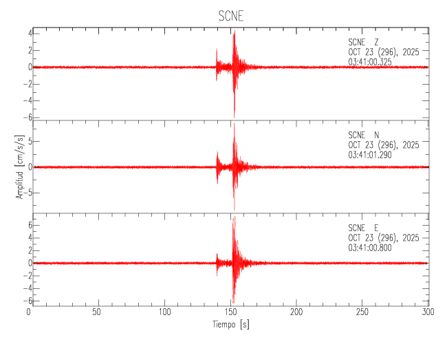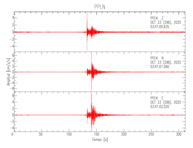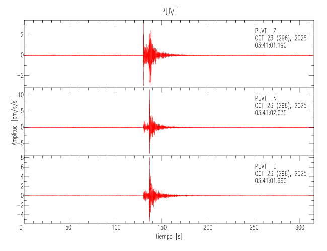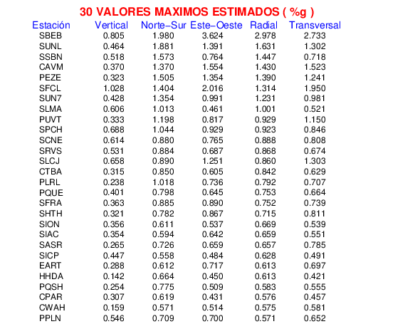 La siguiente tabla muestra los datos de aceleración máxima para cada componente en porcentaje de la aceleración de la gravedad (%g). Estos se obtienen dividiendo el valor del PGA registrado por 980 cm/s2 y multiplicándolo por 100. Los valores de las últimas dos columnas corresponden a la componente radial y transversal. Los datos se listan en orden descendente según el valor de la componente radial.
