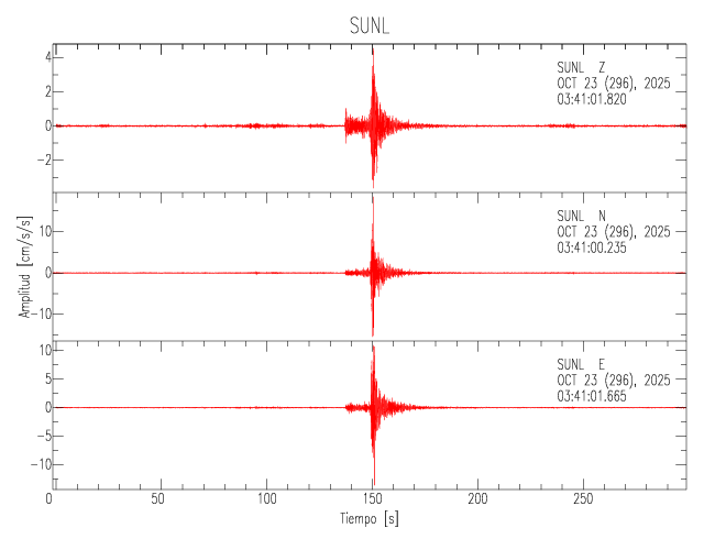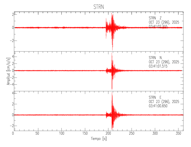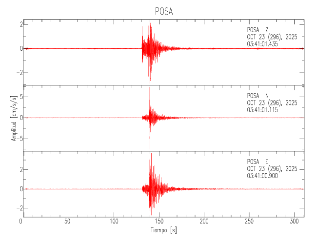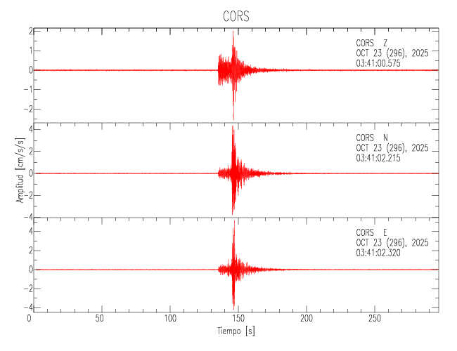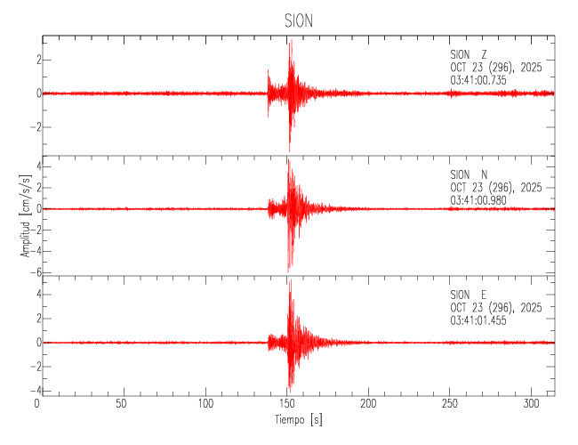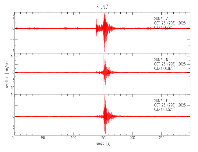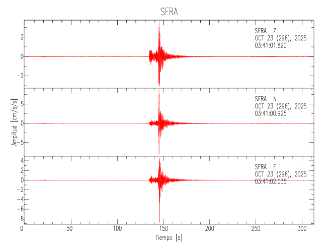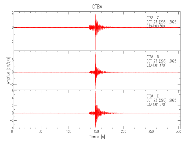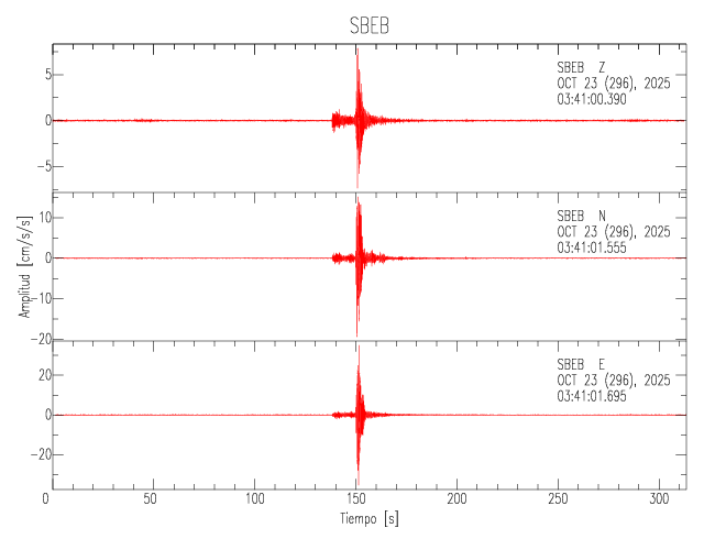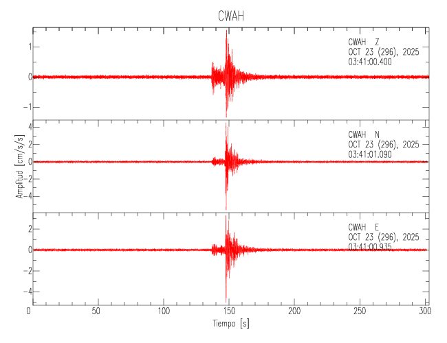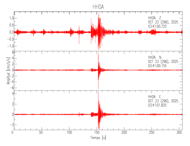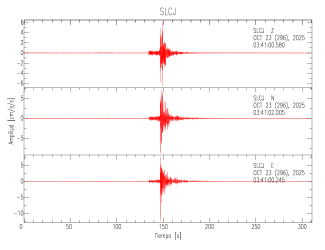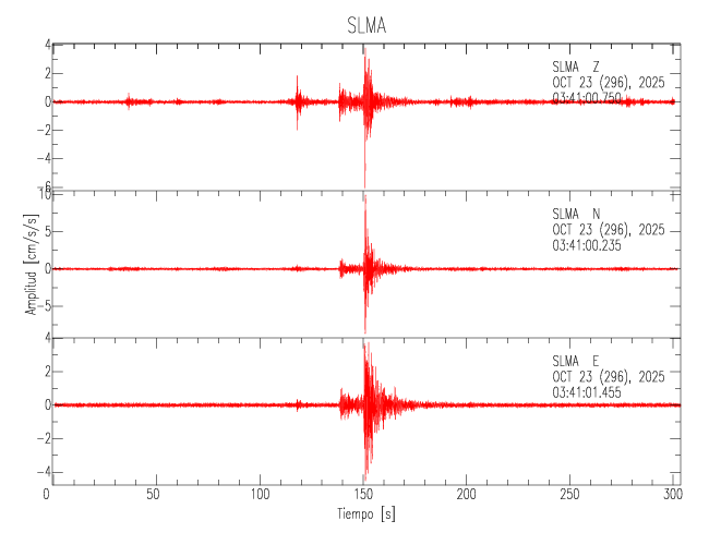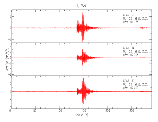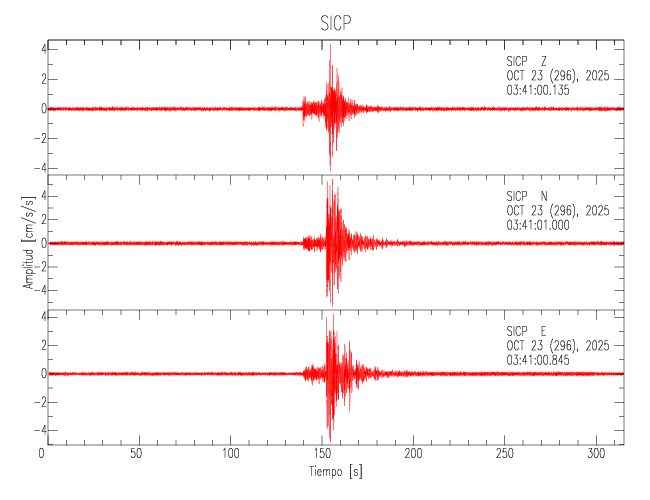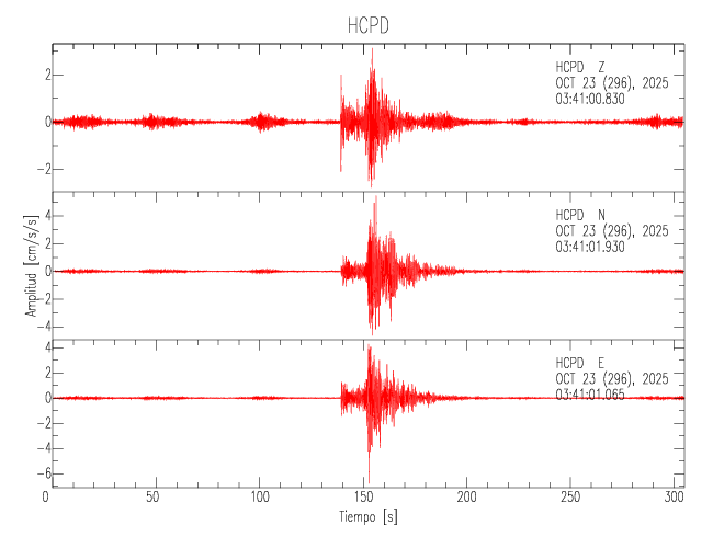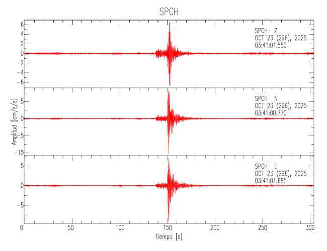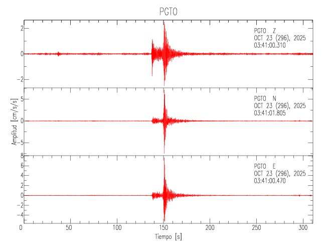 La siguiente tabla muestra los datos de aceleración máxima para cada componente en porcentaje de la aceleración de la gravedad (%g). Estos se obtienen dividiendo el valor del PGA registrado por 980 cm/s2 y multiplicándolo por 100. Los valores de las últimas dos columnas corresponden a la componente radial y transversal. Los datos se listan en orden descendente según el valor de la componente radial.