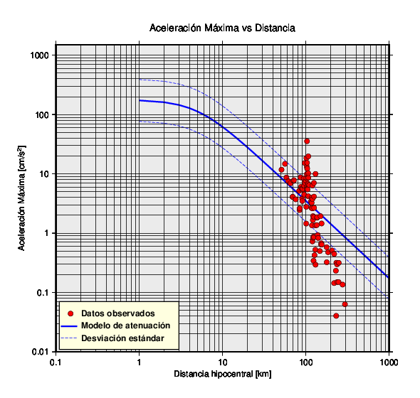 Datos del valor de la aceleración máxima (PGA por sus siglas en inglés) de cada estación (puntos rojos) en función de la distancia al hipocentro. Las trazas azules corresponden al modelo de atenuación y su respectiva desviación estándar.