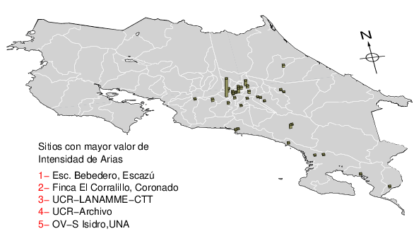 El terremoto de Sámara del 05 de setiembre del 2012 alcanzó un valor de 1207.0 cm/s en la estación de Nosara (GNSR) muy cerca del epicentro. El terremoto de Piedras Negras, que causó graves daños a la ciudad de Alajuela el 22 de diciembre de 1990, alcanzó un valor de 174 cm/s en una estación ubicada en el centro de la ciudad.