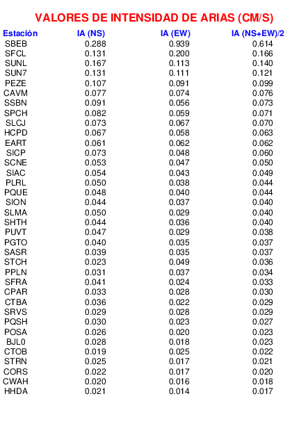 En esta sección se muestra el cáculo de la IA para la componente norte-sur (NS) y este-oeste (EW) de los registros de aceleración que tuvieron valores superiores a los 5 cm/s2, así como el valor total de esta que corresponde al promedio de ambas componentes horizontales.