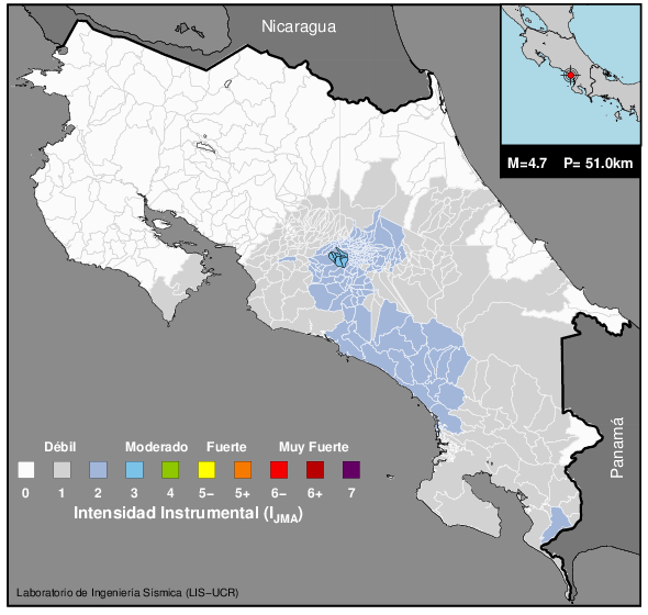 Este mapa muestra la división política de Costa Rica a nivel de distritos. Según nuestros cálculos, la intensidad de grado 3 o superior en la escala de JMA (que varía de 0 a 7) afectó un total de 7 distritos. La lista de estos se muestra bajo del mapa en orden alfabético.