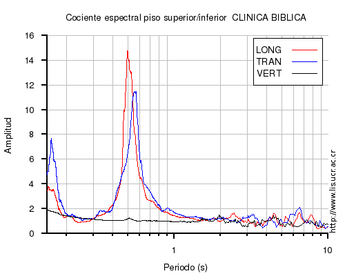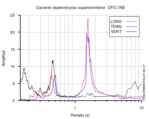 También se muestra el cociente espectral (en el rango de 0.1 a 10 s) entre el nivel superior (sea el último piso o la azotea) e inferior (sea el primero piso o el sótano) para cada una de las componentes LONG=longitudinal, TRAN=transversal y VERT=vertical. En los casos en que el nivel superior o inferior no estén disponibles al momento del sismo, se muestra una imagen con la leyenda "No se pudo calcular".