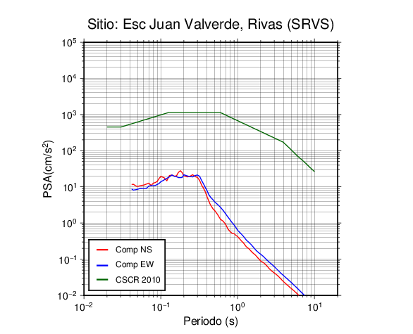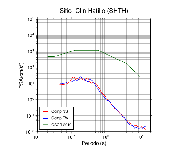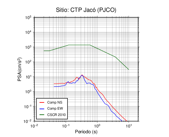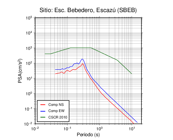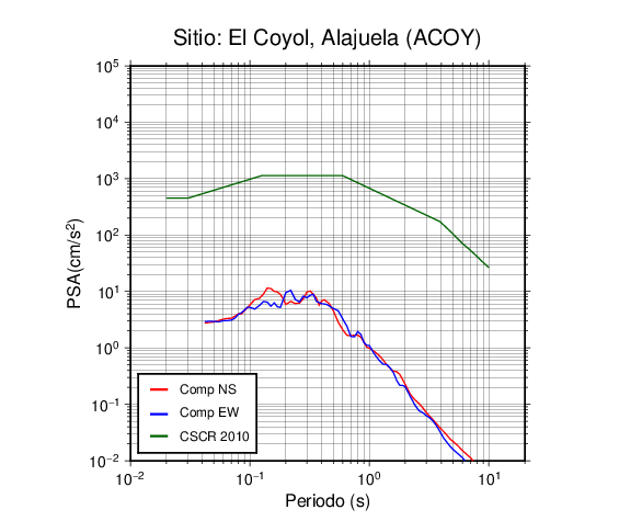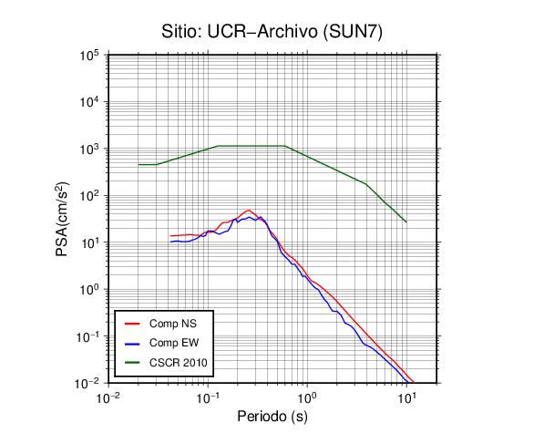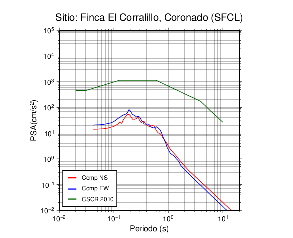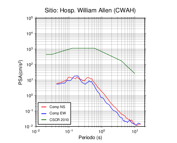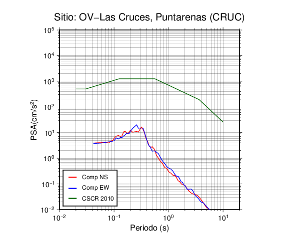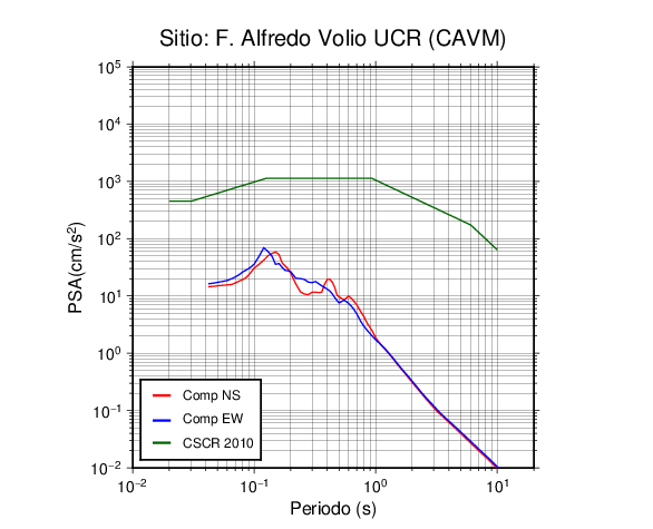 En los siguientes gráficos, la traza verde es el espectro propuesto por el CSCR-2010, la traza roja es el espectro de este sismo en la componente norte-sur (NS) y la traza azul la componente este-oeste (EW). El valor de la amplitud está dado en pseudoaceleración en cm/s2.